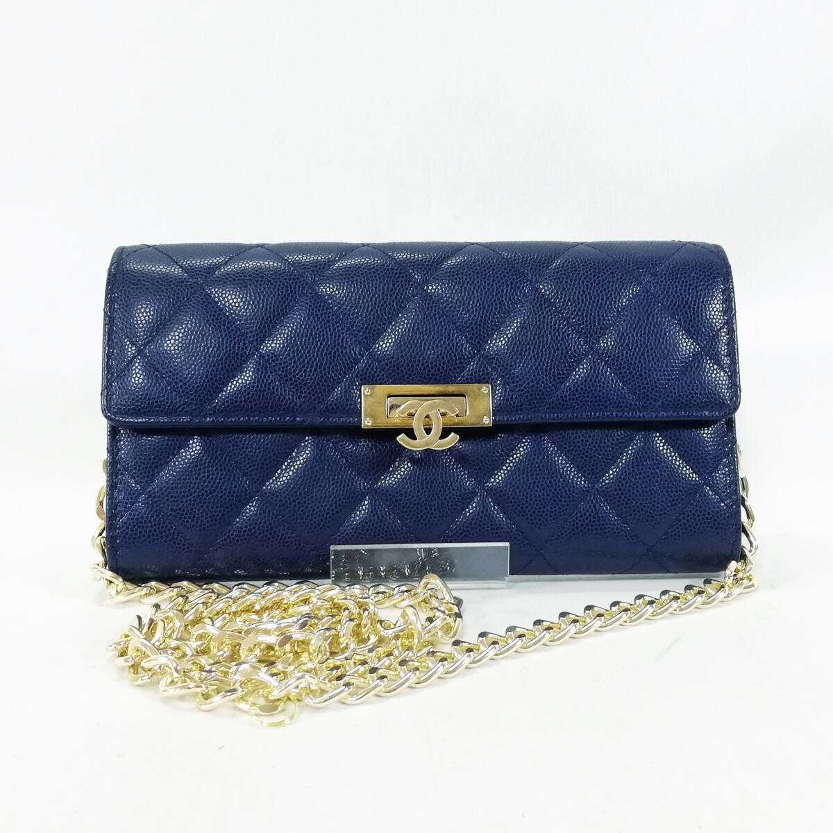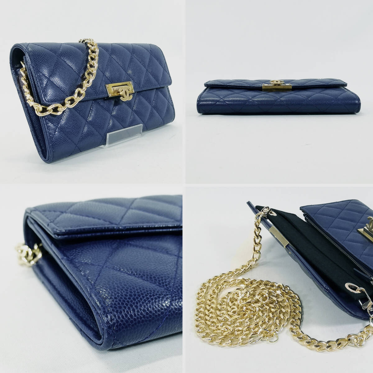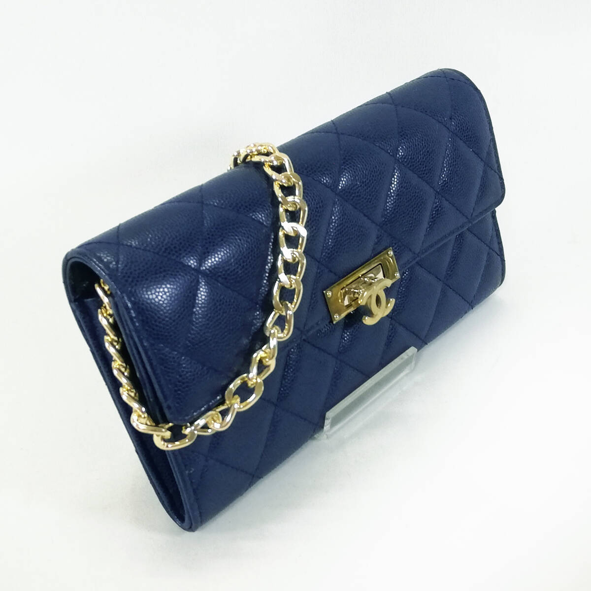 【美品】CHANEL(シャネル)マトラッセ キャビア 長財布 ココロック 青 ブルー チェーンウォレット ショルダー【送料無料】101