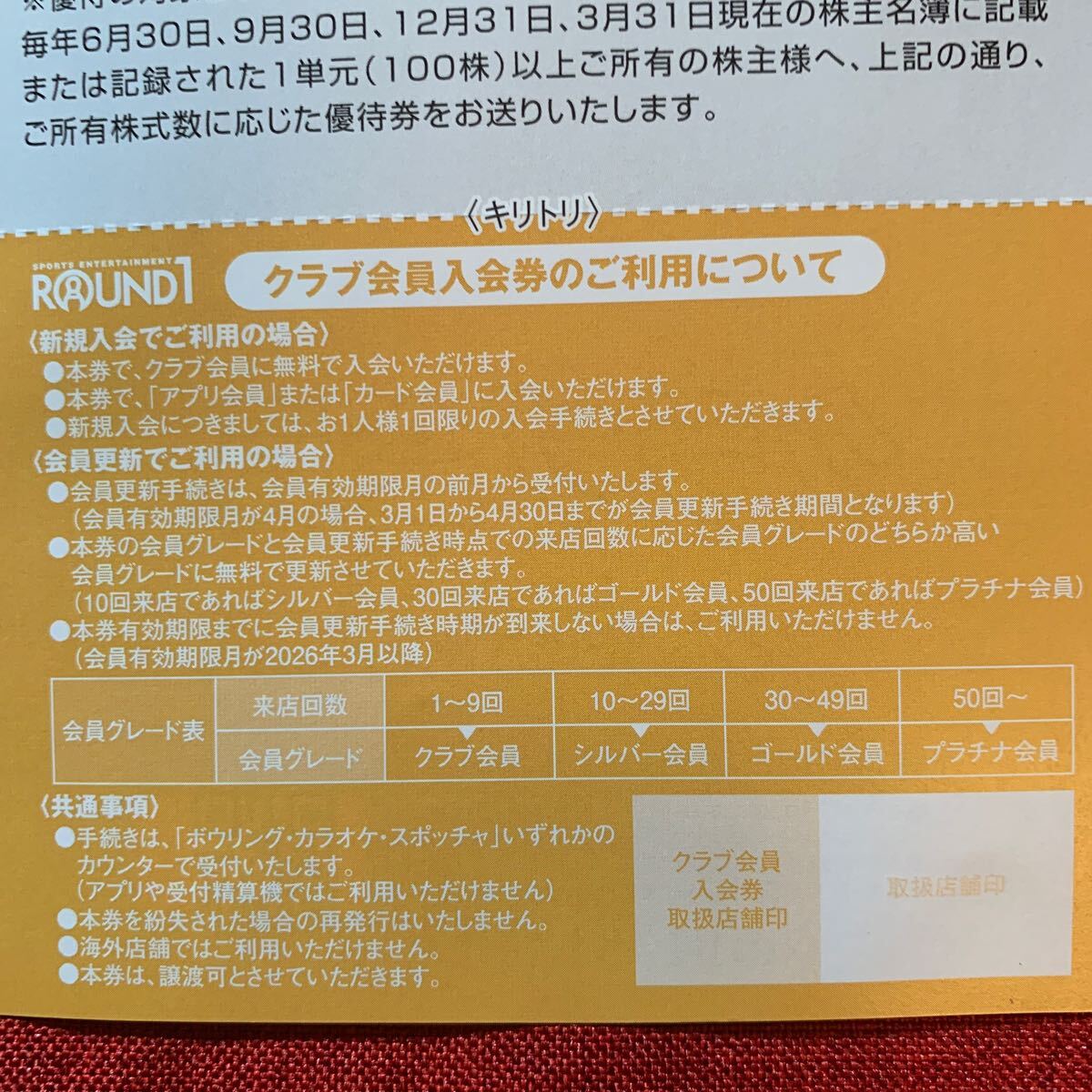 ラウンドワン株主優待券500円×3枚+クラブ会員入会券1枚+健康ボウリング教室レッスン優待券1枚で個数1です。