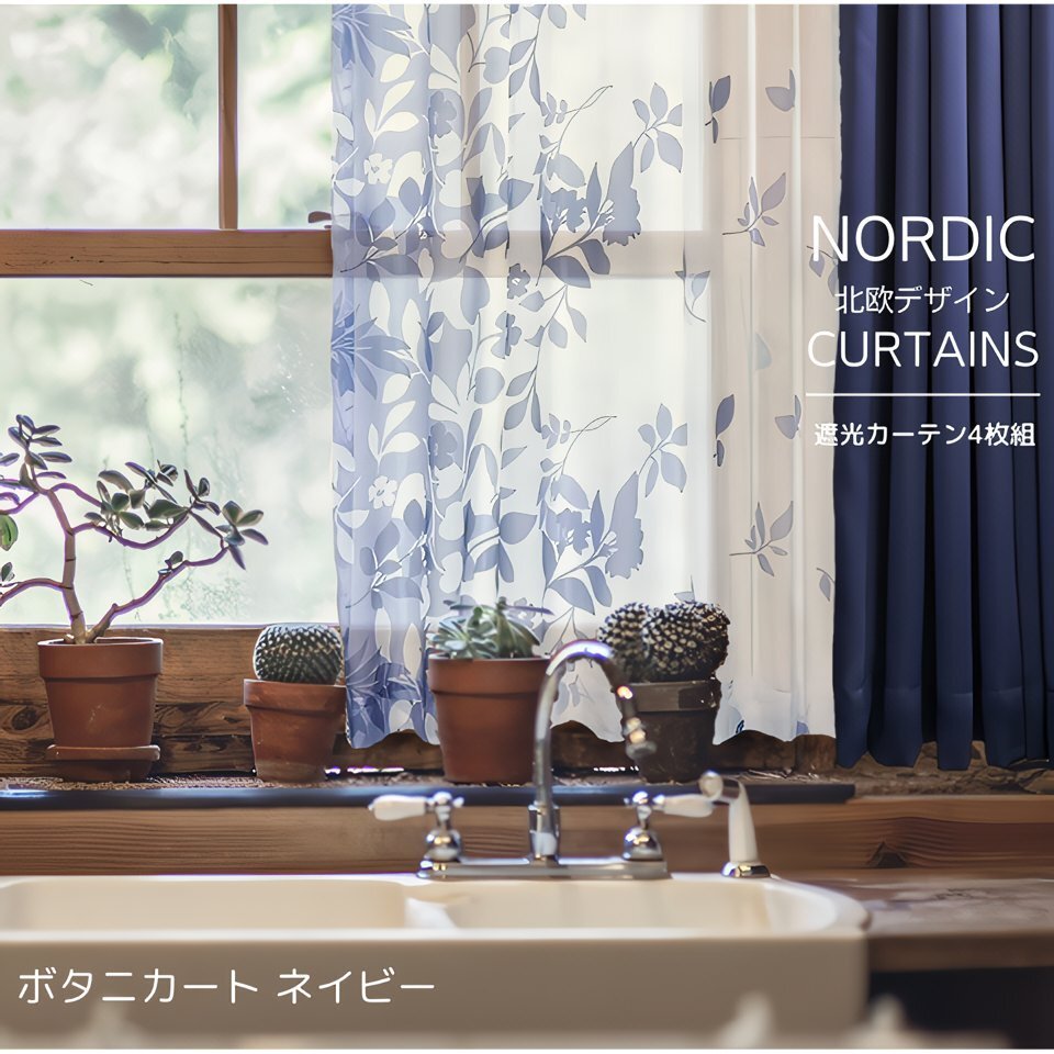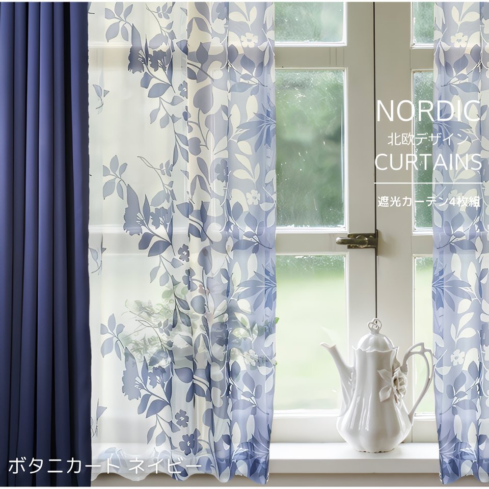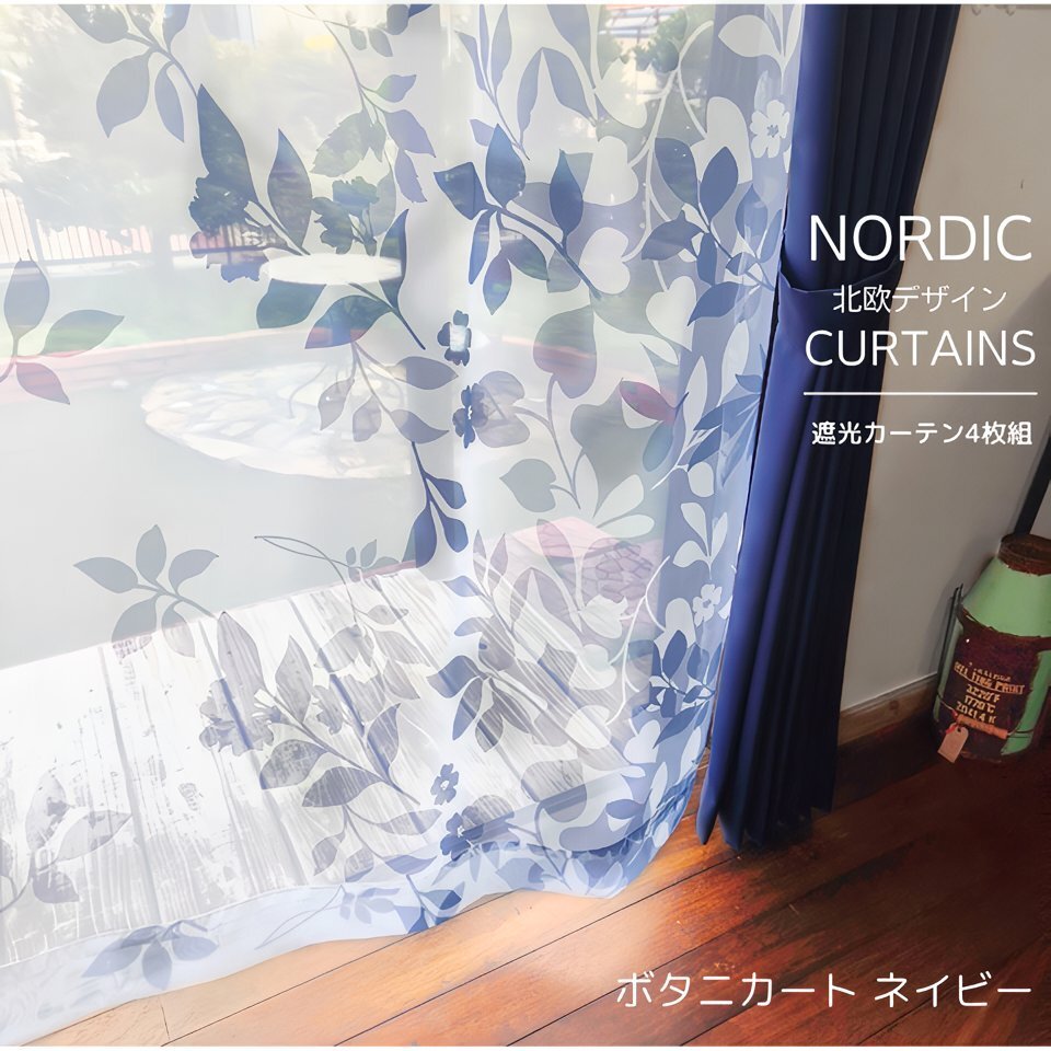 | こちらはボタニカート/ネイビー 丈220cmのページです。 3級遮光厚地2枚+北欧風レース2枚の 合計4枚セットカーテン | ||||