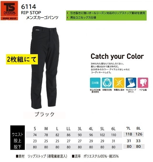 ビックイナバ特価◆TSDESIGN 6114 RIP STOPメンズカーゴ【95ブラック・8Lサイズ】定価1枚8360円の品が、2枚組で即決2980円