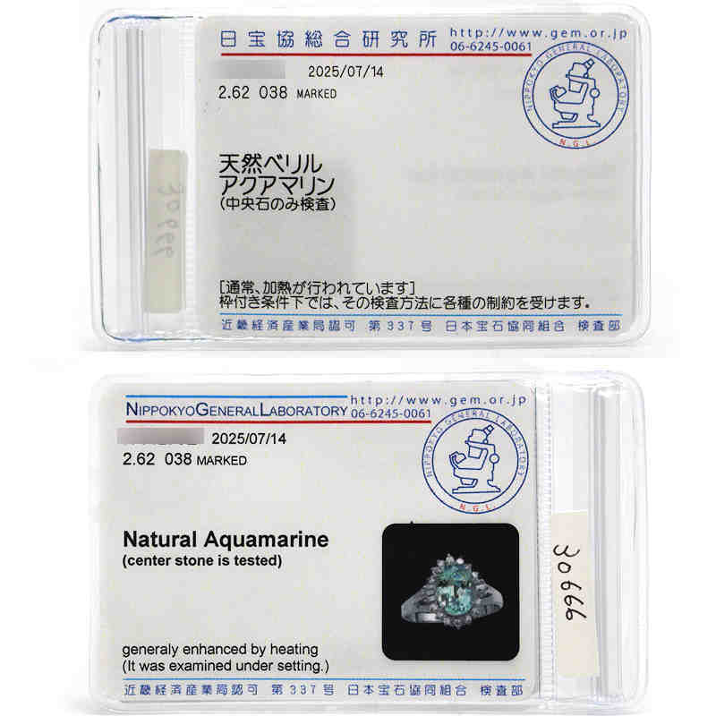 ソーティング記載 | 天然ベリル アクアマリン (中央石のみ検査) 通常、加熱が行われています |