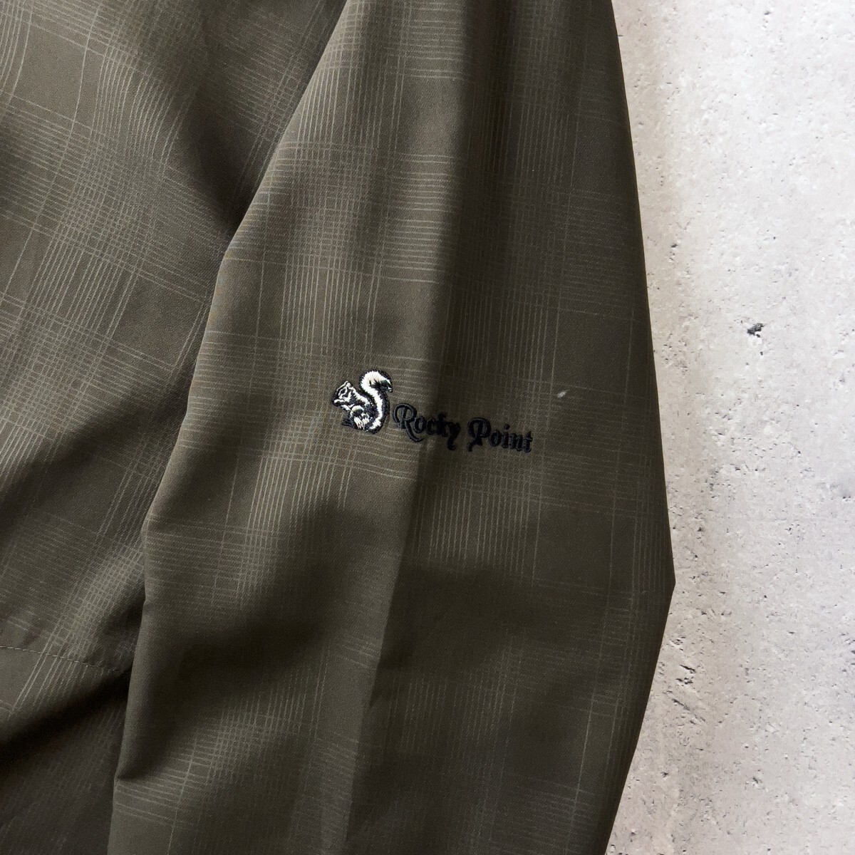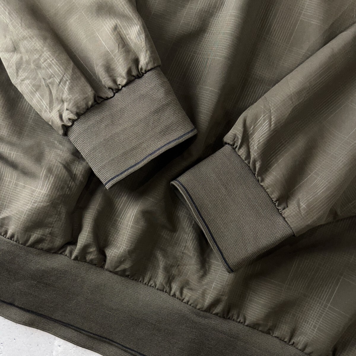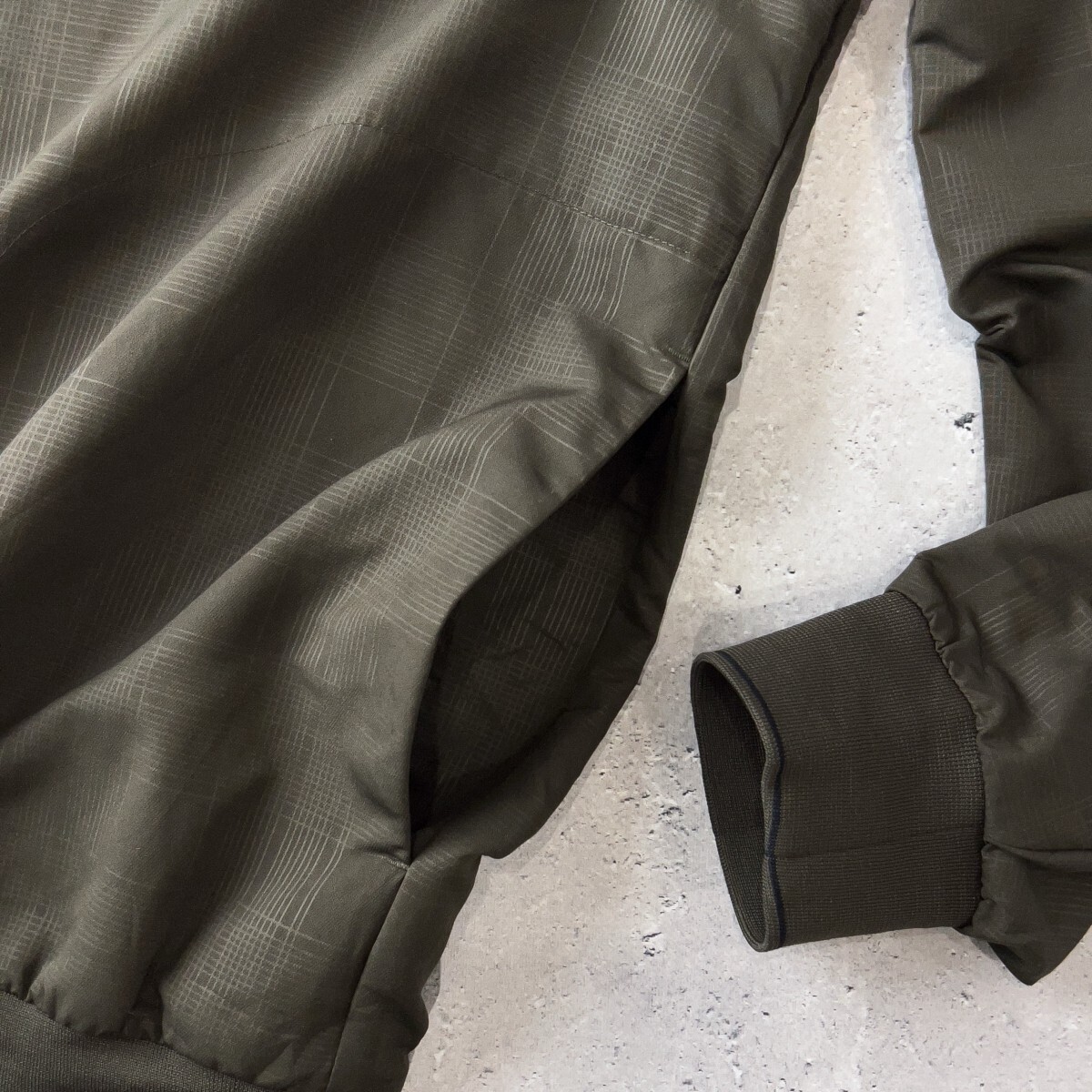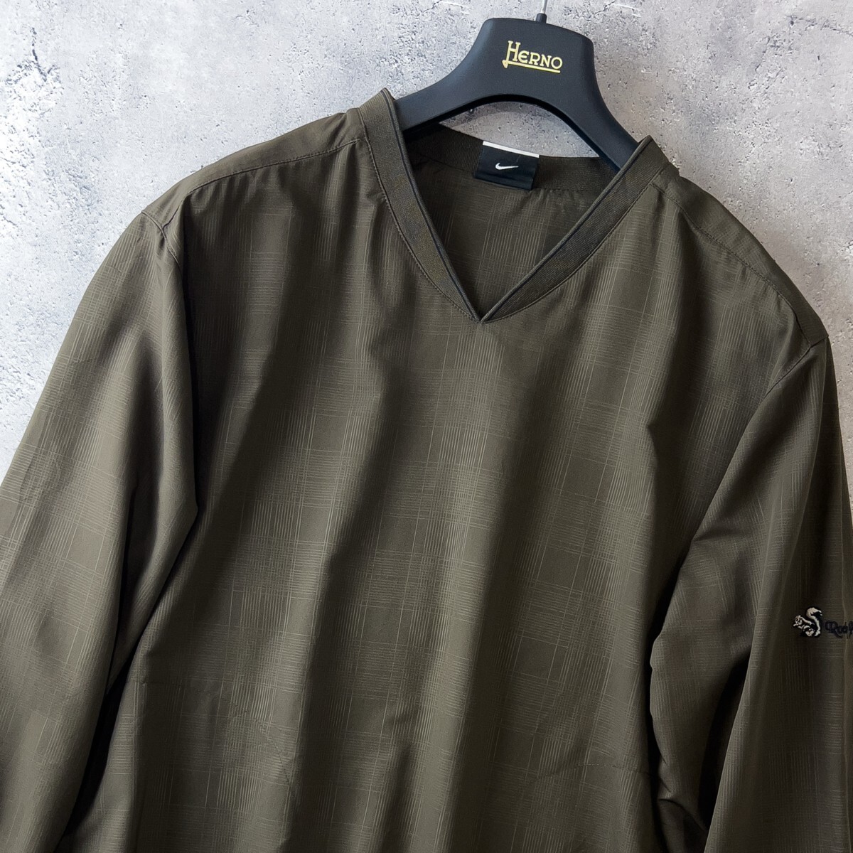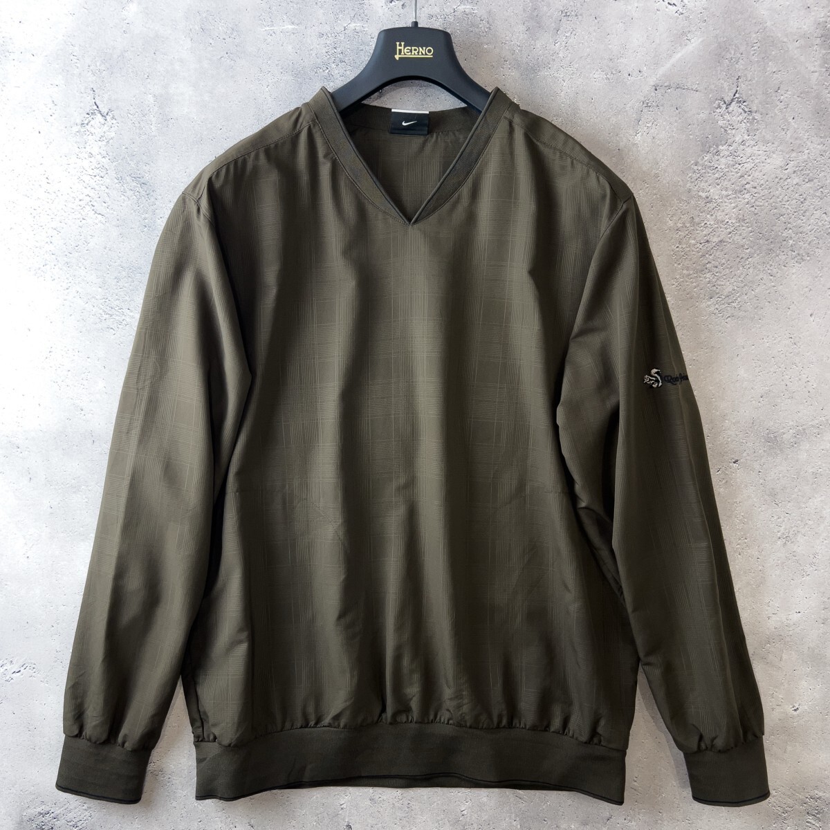 ◆ナイキゴルフのVネック長袖スニード。カーキカラーの落ち着いたトーンに、さりげないチェック柄が上品さを演出します。