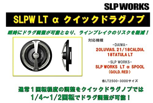「ダイワslpワークス(Daiwa Slp Works) LT TYPE-α クイックドラグノブ」▼4560454388438▼(商品説明)LT αタイプ・ 00082260・・Style:LT αタイプ・入数:1個入り・対応機種:21・18CALDIA / 20LUVIAS / TATULA LT / BALLISTICシリーズ (LT2500~LT3000サイズ)・自重:8g説明 通常1回転程度の調整が必要だった通常品と比べ、「クイックドラグノブ」では「1/4~1/2回転」でドラグ調整が可能! ATDの特性は活かしつつ、アングラーが積極的にドラグテンションをコントロールすることでライトラインへの対応力を高め 、 イニシア ティブは常にアングラー側にあるやり取りが可能となる! 思い通りにドラグテンションをコントロールする為のアイテムで中・上級者の方におすすめのチューニングパーツ! ランディング間際の急な突っ込みにも、瞬時なドラグ調整が可能となり、ラインブレイク のリスクを減らす事が出来ます!