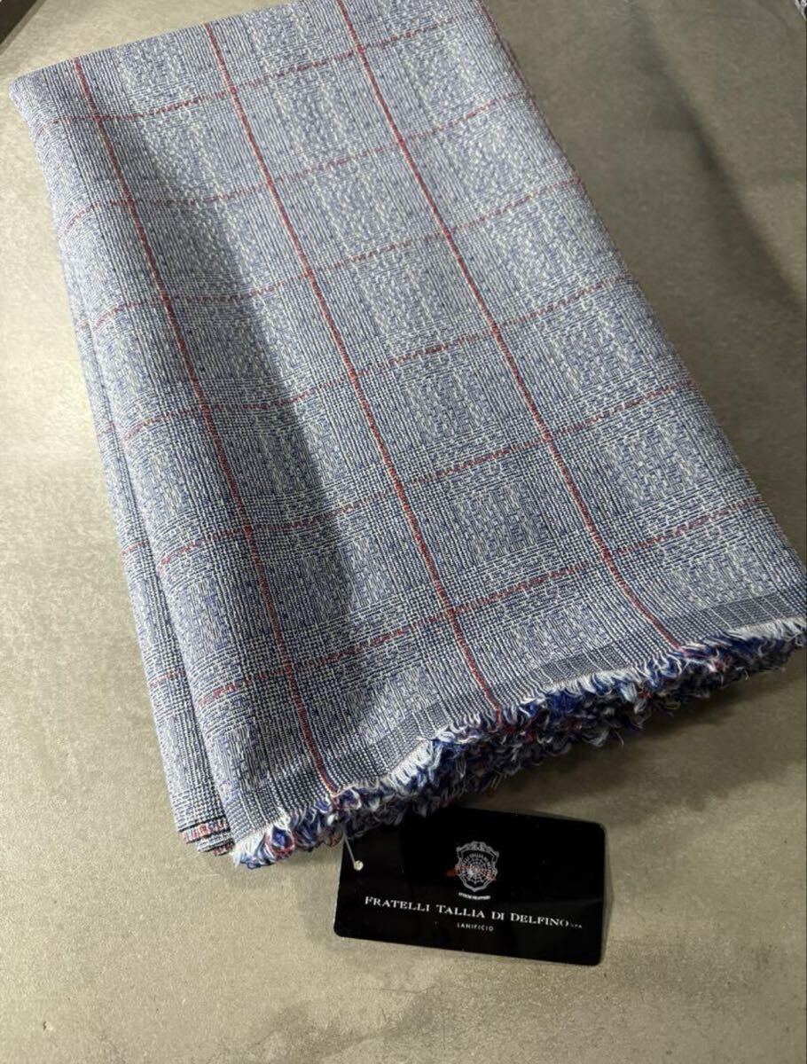 イタリア、デルフィノ社のブルーグレーに赤の格子柄が入った生地。