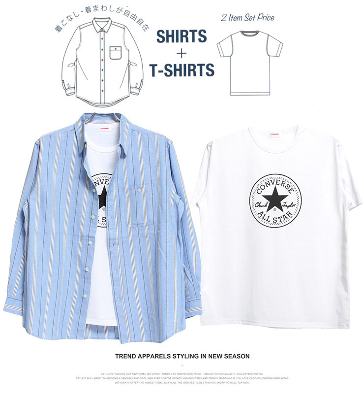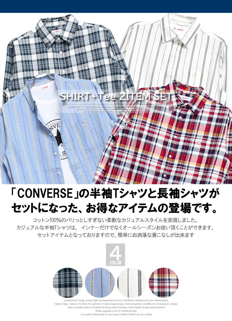| 商品説明 | スニーカーでお馴染み「CONVERSE/コンバース」の半袖プリントTシャツと、総柄の長袖シャツがセットになった、お得なアイテムの登場です。 |