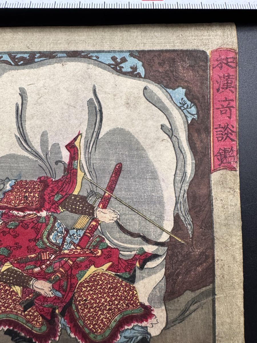 【真作】妖怪!本物浮世絵木版画 月岡芳年【和漢奇談鑑 晋将武】象 明治期 武者絵 中判 錦絵 保存良い 裏打ち