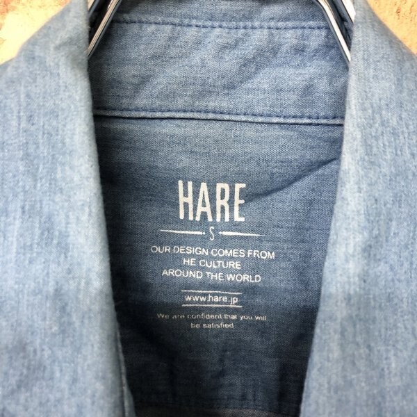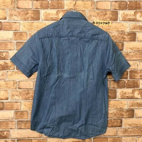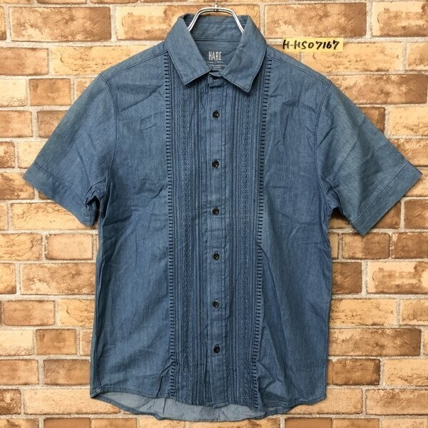 HARE ハレ メンズ フロント刺繍入り 半袖 デニムシャツ シャンブレー ダンガリー S 青 ブルー カジュアル