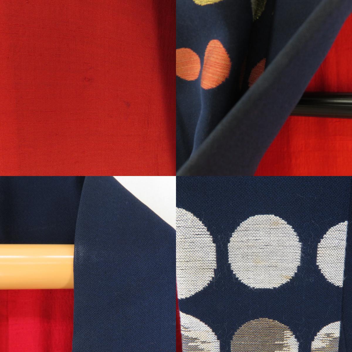 | 御召 アンティークレトロ 水玉模様 紺色x赤色 正絹 袷 バチ衿 カジュアル 紅絹 お召着物 仕立て上がり リサイクル 身丈152cm |