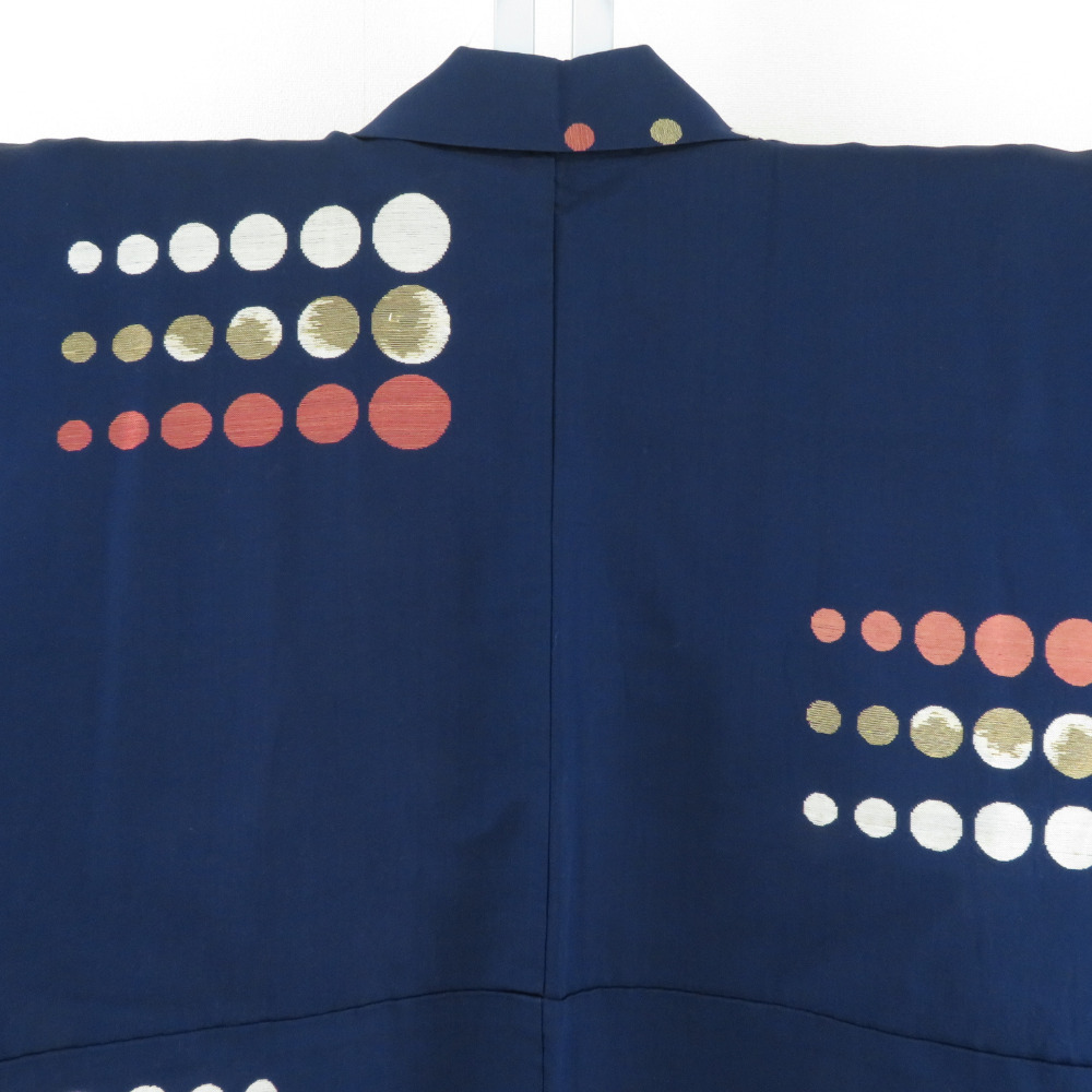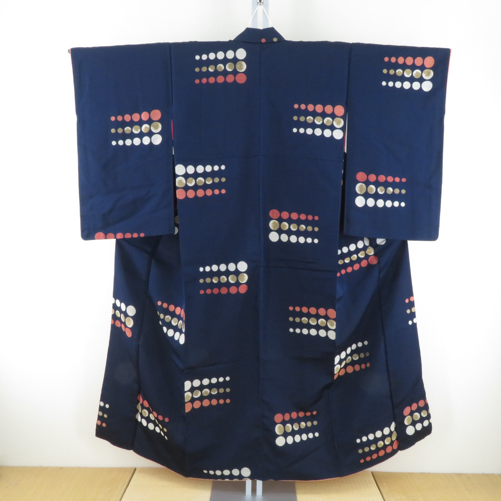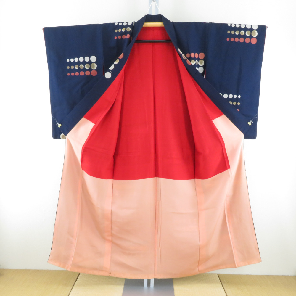 | 御召 アンティークレトロ 水玉模様 紺色x赤色 正絹 袷 バチ衿 カジュアル 紅絹 お召着物 仕立て上がり リサイクル 身丈152cm |