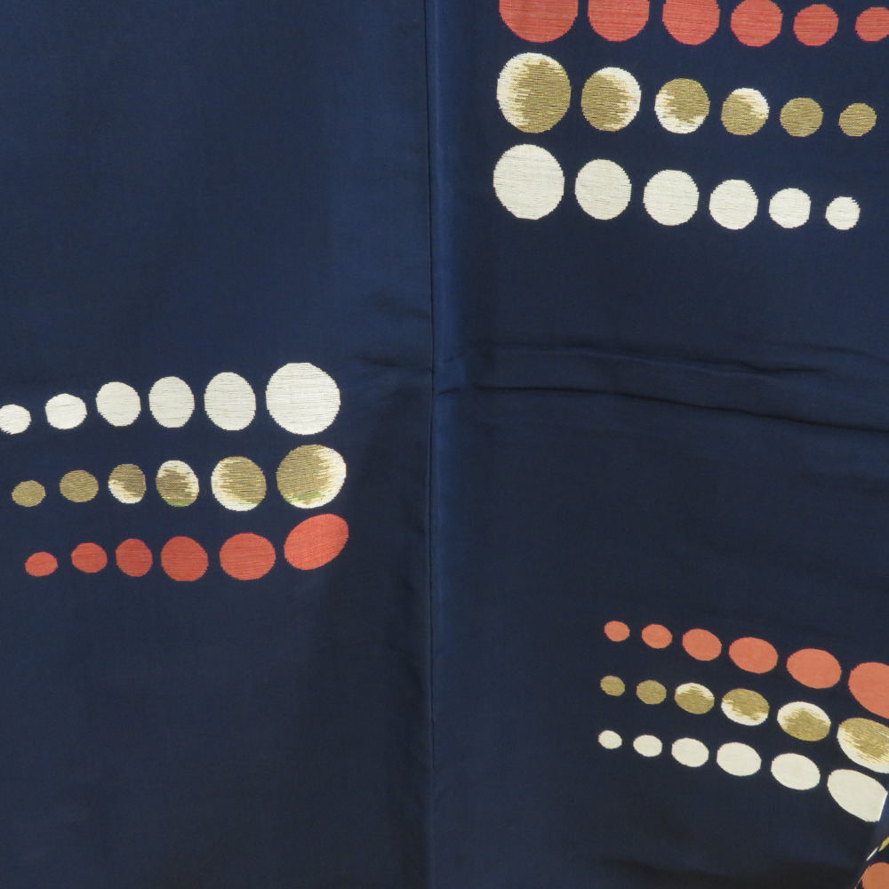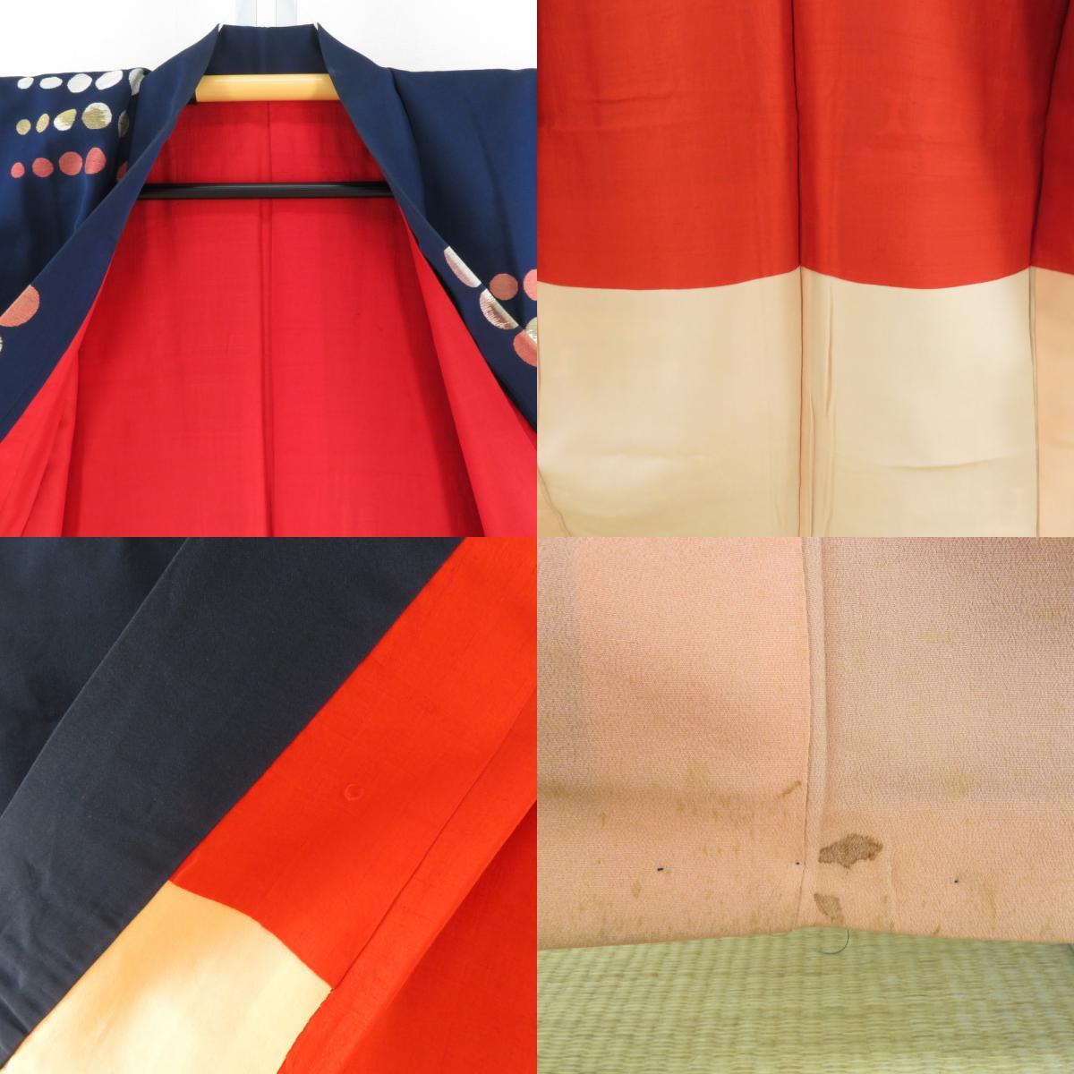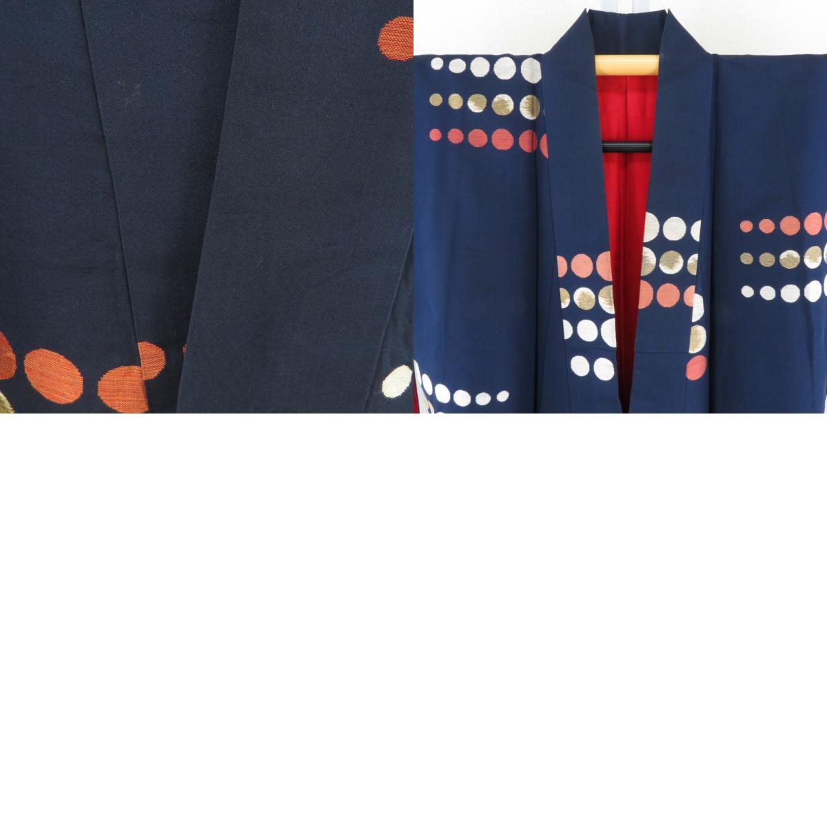 | 御召 アンティークレトロ 水玉模様 紺色x赤色 正絹 袷 バチ衿 カジュアル 紅絹 お召着物 仕立て上がり リサイクル 身丈152cm |