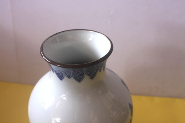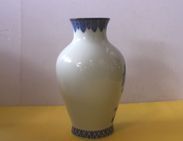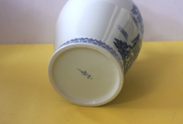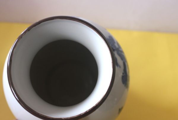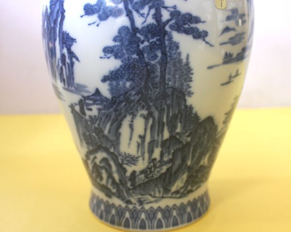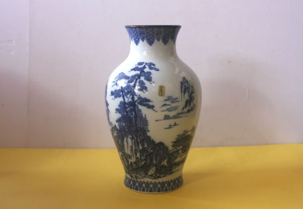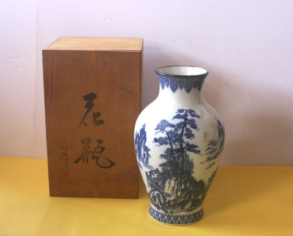 山治陶苑 染付松山水文様 花瓶 陶器の花器 美濃焼 花器 桐箱付き サイズ:外径15×H30cm /27N8.7-72