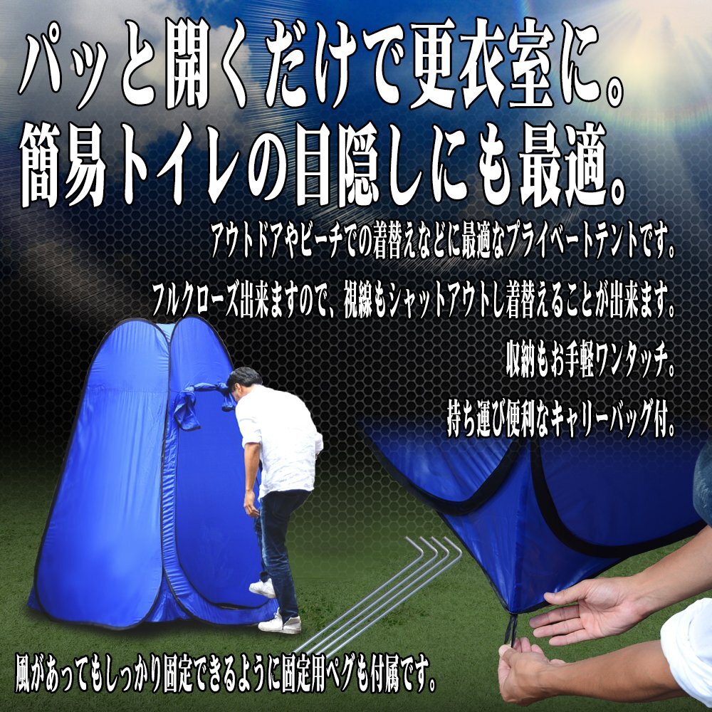 海水浴やアウトドアでの着替えに! 女性やお子様でも1人で簡単に設営できる キャンプや海や川などに行ったときに、車内での着替えは狭くて辛い! 中はゆったり広々で大人でも楽に着替えができます! 災害時には中に簡易トイレなどに設置としてトイレとして使うこともできます!