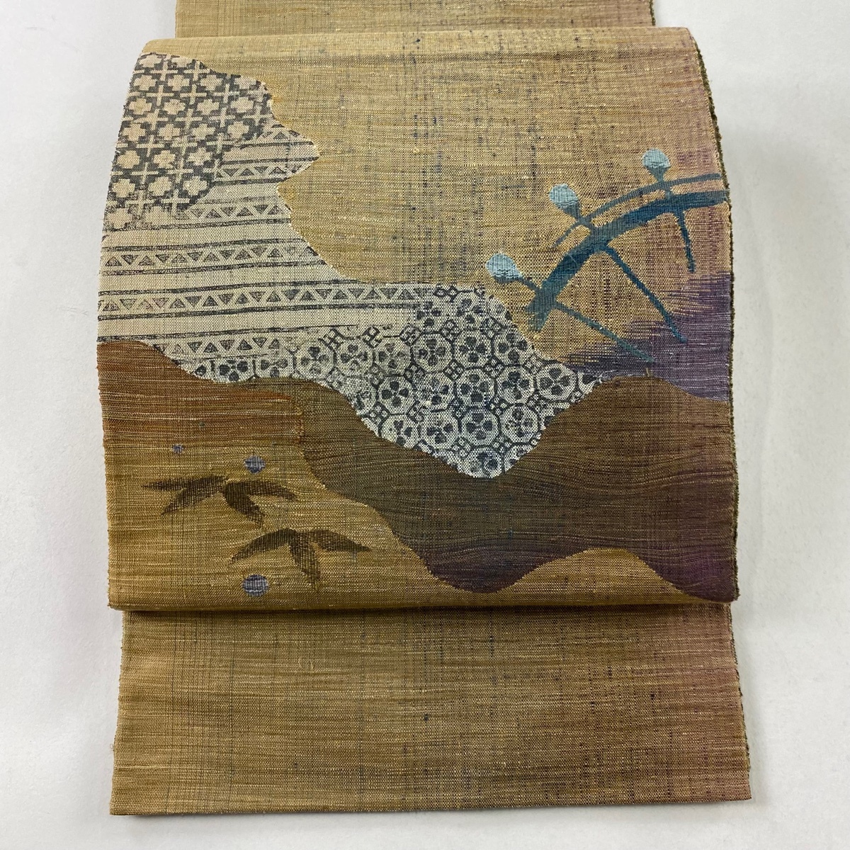 | 袋帯 美品 秀品 紬地 道長取り 笹 茶緑色 お太鼓柄 正絹 【中古】 |