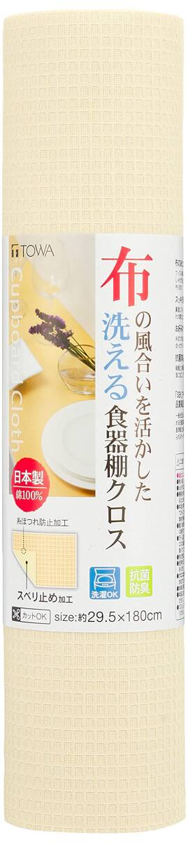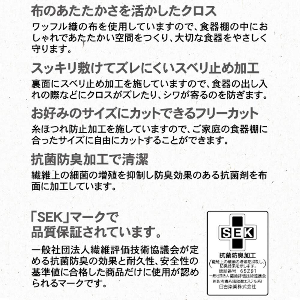 商品紹介 ○布の風合いを活かした洗える食器棚クロス。○ワッフル織りの布を使用しているので食器棚の中におしゃれであたたかい空間をつくり大切な食器をやさしく守る。○裏面にスベリ止め加工を施しているので食器の出し入れの際などにクロスがズレたりシワが寄るのを防ぐ。○糸ほつれ防止加工を施しているのでご家庭の食器棚に合ったサイズに自由にカットすることができる。○カニやエビ等の殻から最先端のバイオテクノロジーで精製され高い抗菌防臭効果を持つキトサンを布面に配合。○SEKマークで品質されている。 本体サイズ(約):29.5×180cm本体重量(約):103g 本体:綿裏面:メタクリルブタジエンゴム より ●布の風合いを活かした洗える食器棚クロス ●ワッフル織りの布を使用しているので、食器棚の中におしゃれであたたかい空間をつくり、大切な食器をやさしく守る ●裏面にスベリ止め加工を施しているので、食器の出し入れの際などにクロスがズレたり、シワが寄るのを防ぐ ●糸ほつれ防止加工を施しているので、ご家庭の食器棚に合ったサイズに自由にカットすることができる ●カニやエビ等の殻から最先端のバイオテクノロジーで精製され、高い抗菌防臭効果を持つキトサンを布面に配合 ●SEKマークで品質されている