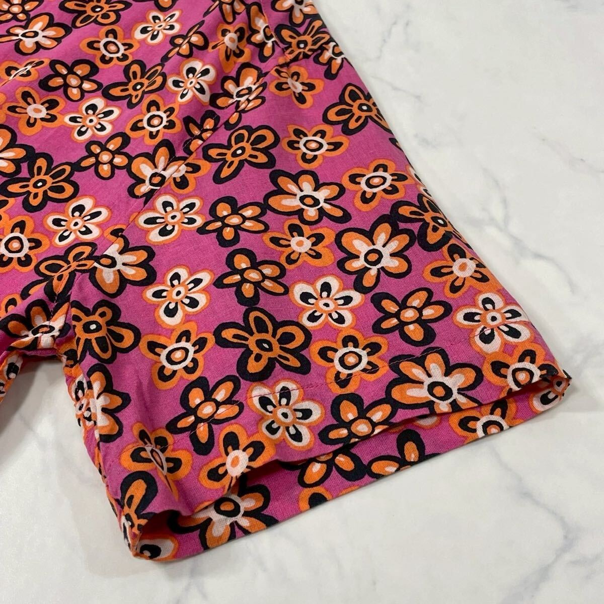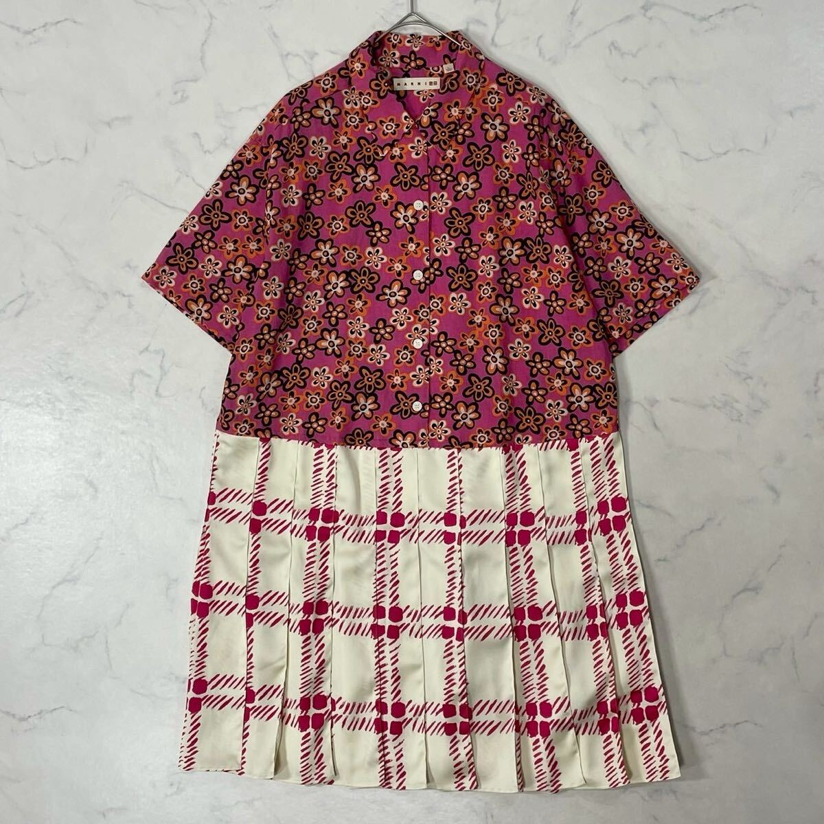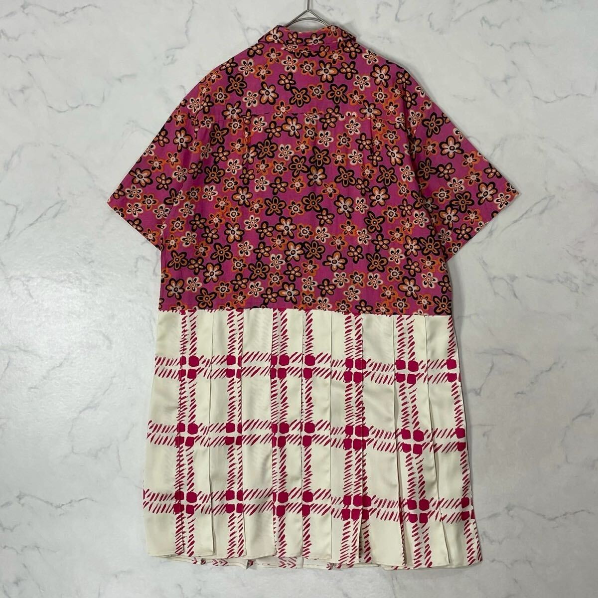 大きいサイズ 切替 異素材 花柄 チェック タック ボタン 開襟 麻混 半袖 プリーツ フレア ひざ丈 ワンピース