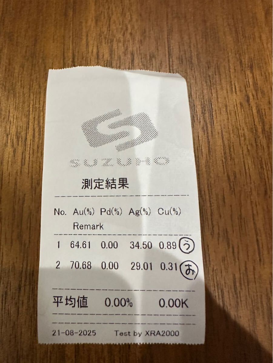 レシートの画像は、質屋さんでの比重測定結果になりますので、参考にまでよろしくお願いします。(1裏面測定2表面測定)k14金は保証