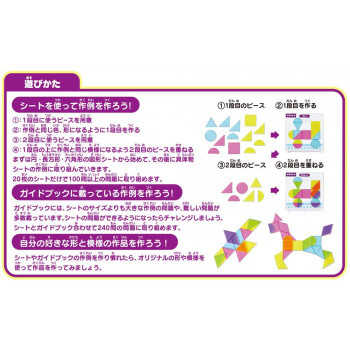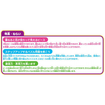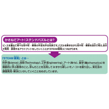 ピースを重ねて様々な色や形や模様の作品を作ることができる玩具です。図形と色の2つの要素の組み合わせを考えながらパズルを解くと同時に、作品を作り上げる創造力や表現力を養うことで「STEAM教育」につながります。 |