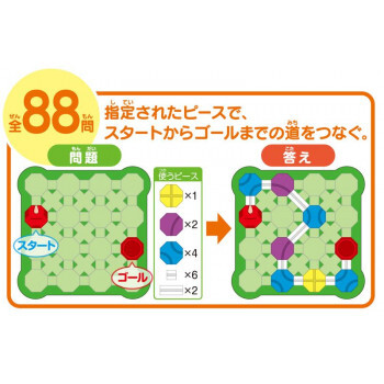 | ロジカルロードメーカーは、スタートからゴールまでの道をつなぐパズルです。使えるピースの数や種類、ゴールまでのピースがはまる方向や距離といった情報を基に、ピースの置き方を論理的に考えてパズルを解きます。楽しく遊びながら論理的思考力やプログラミング的思考を養います。 |