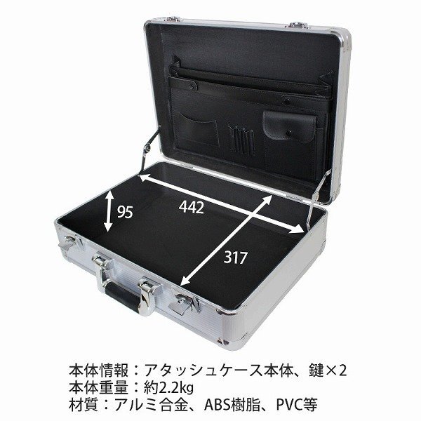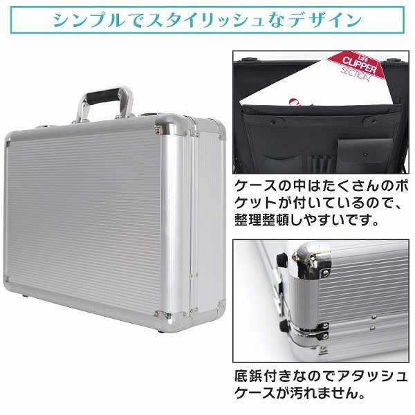 軽量で頑丈、抜群の容量を誇るアルミアタッシュケース。 シンプルなデザインと軽量で丈夫なボディでシーンを選ばず大活躍! ポケットも充実でたっぷり収納で、分厚いカタログなどもしっかり入ります。 盗難防止用の鍵も付いていて、出張など長時間の移動にもしっかり対応します。 ノートPC・書類・メディア・貴重品の収納等、多彩な用途にご利用頂けます♪ ●商品仕様 カラー:シルバー サイズ(約): ・外寸:455X411X152mm ・内寸:442×317×95mm 重量(約)2.2Kg 材質:アルミニウム合金、PVC、ABS樹脂他 |