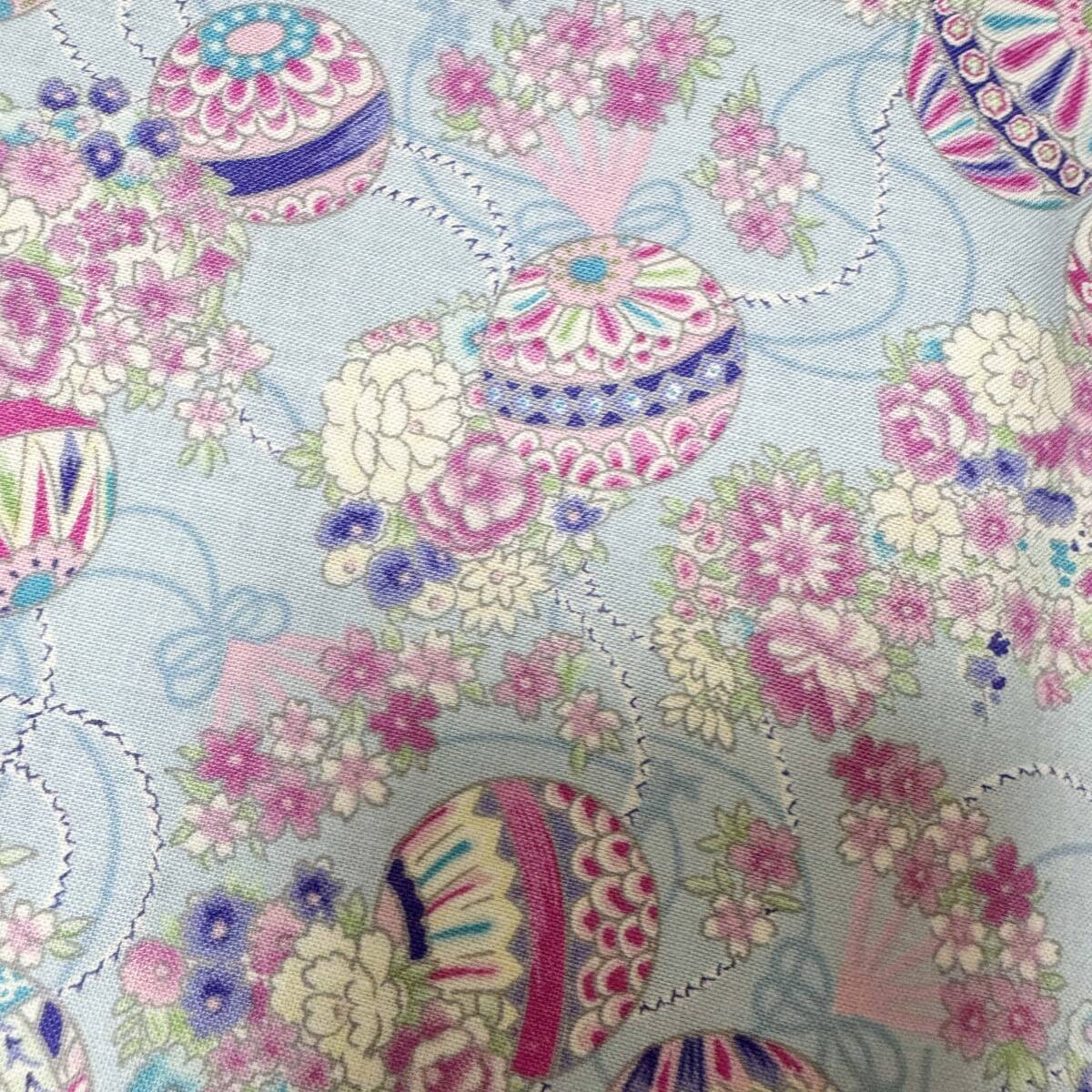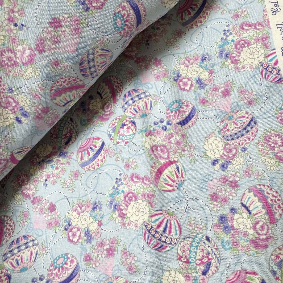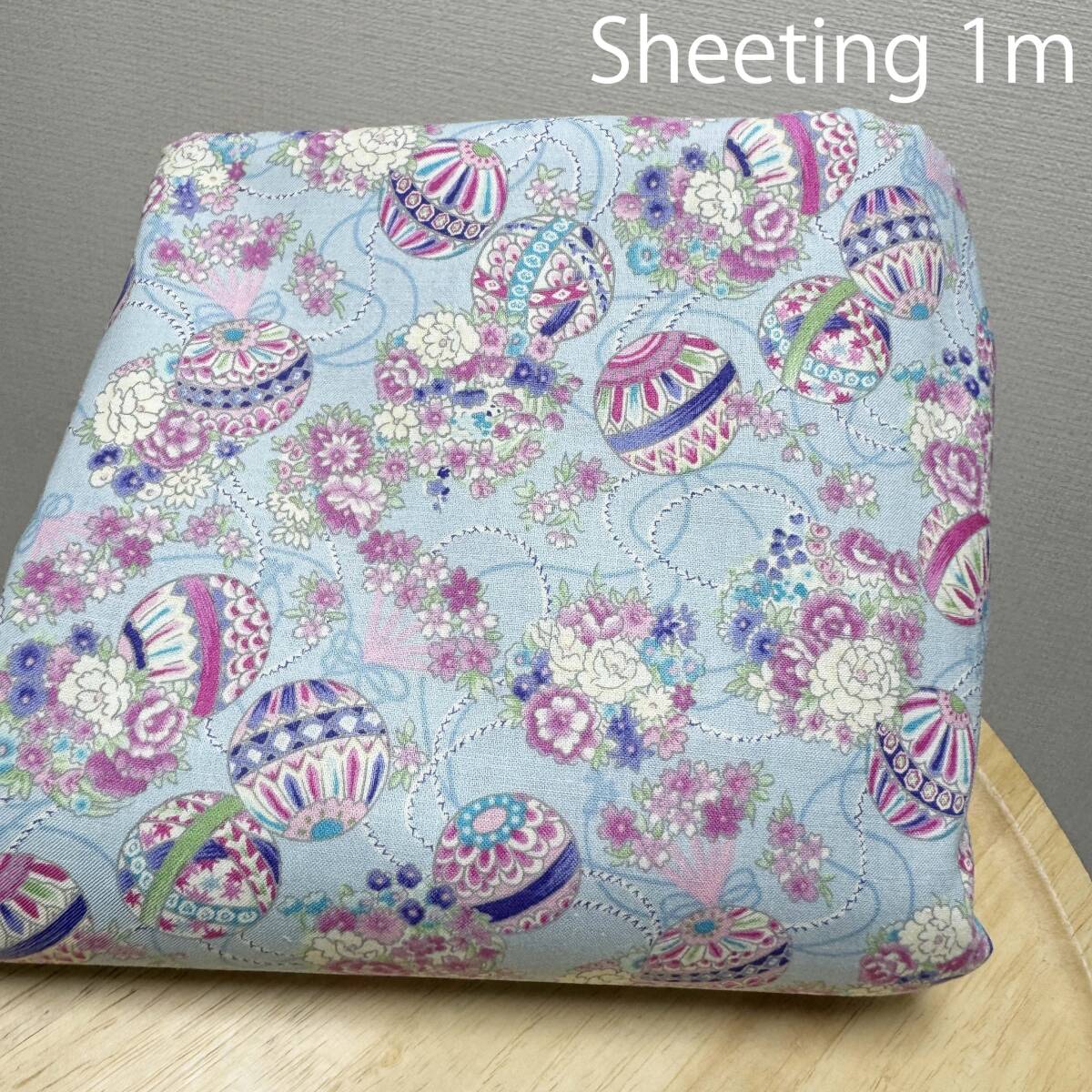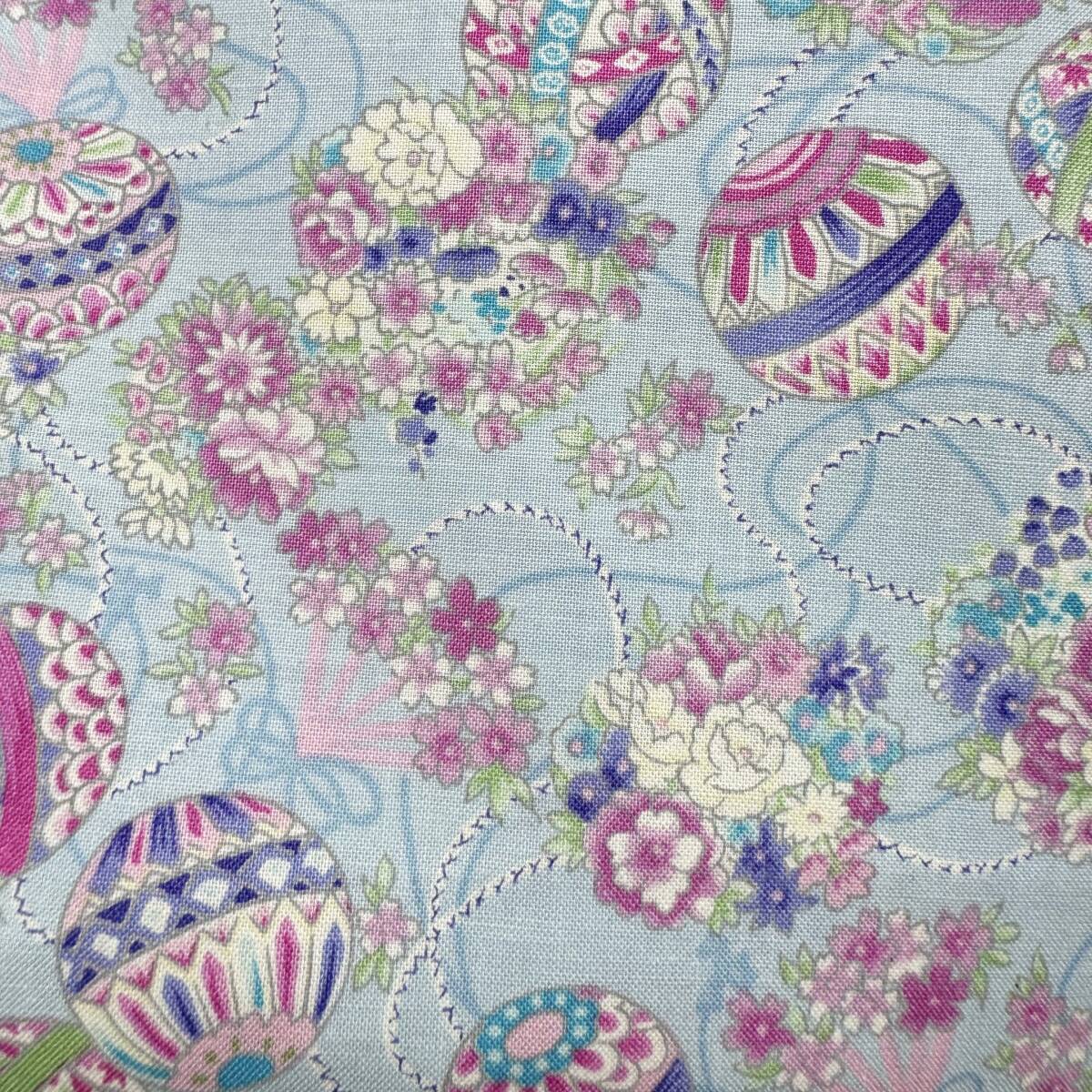 【特価】和モダン調★水色地に手毬と花柄★綿シーチング生地1m布はぎれ★和柄★和風