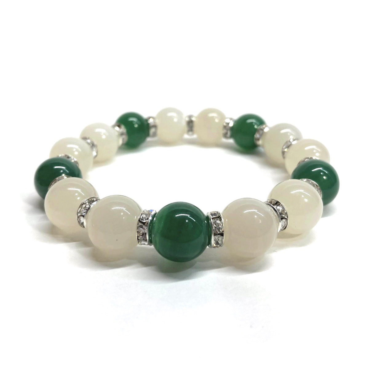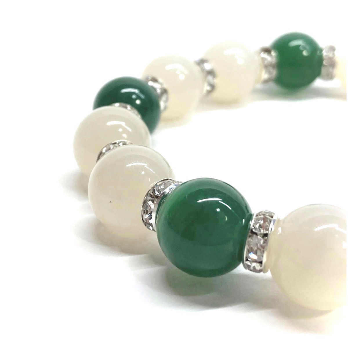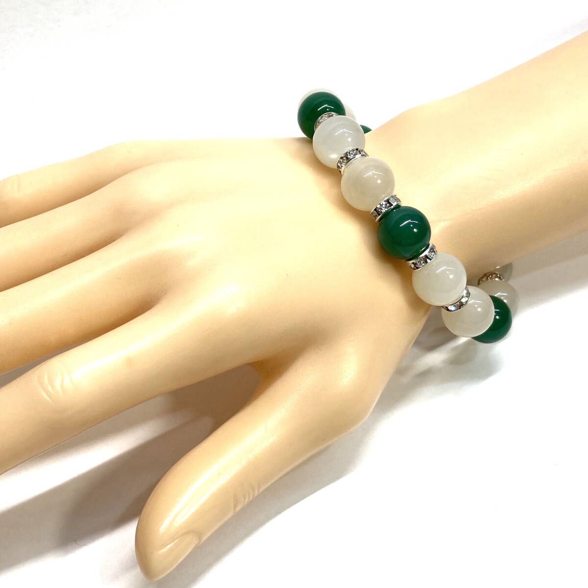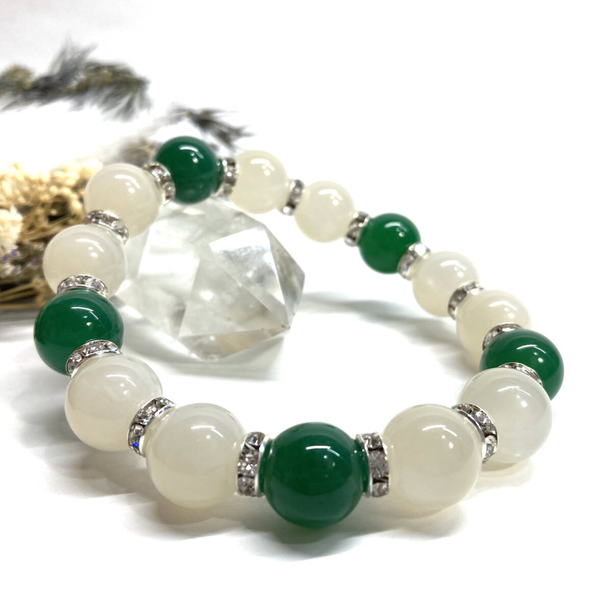 こちらは、ムーンストーンと緑瑪瑙を組み合わせたパワーストーンブレスレットです。間にはロンデルを挟み高級感あるデザインに仕上げております。程よくインパクトがある12mm玉を使用して内周約18cmです。(サイズ変更の場合は取引ナビにてご連絡をお願いします。) 数に限りがございますので気になる方はお早めにどうぞ。