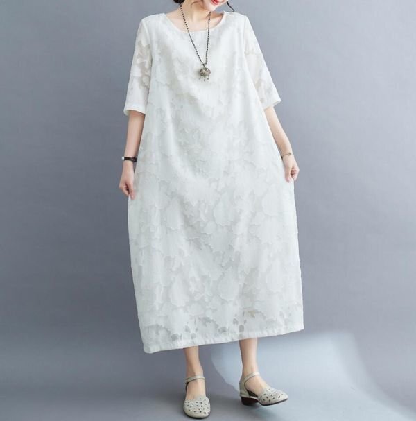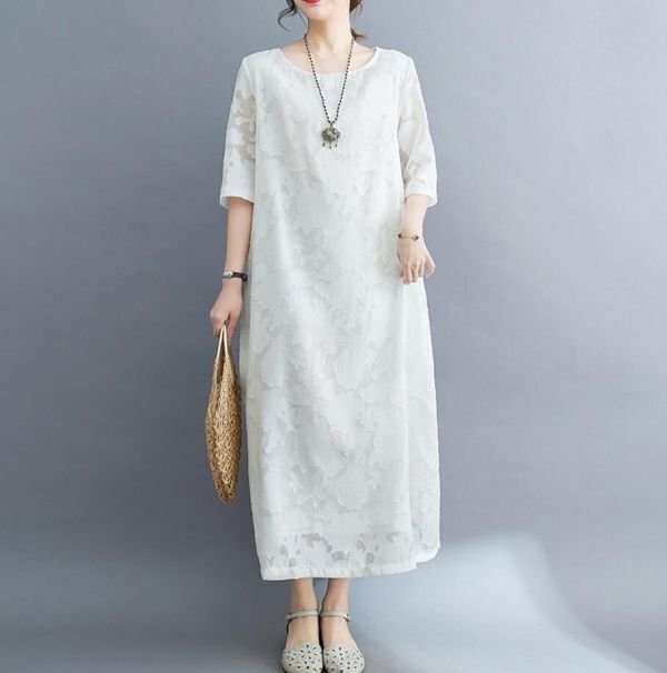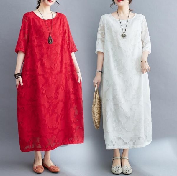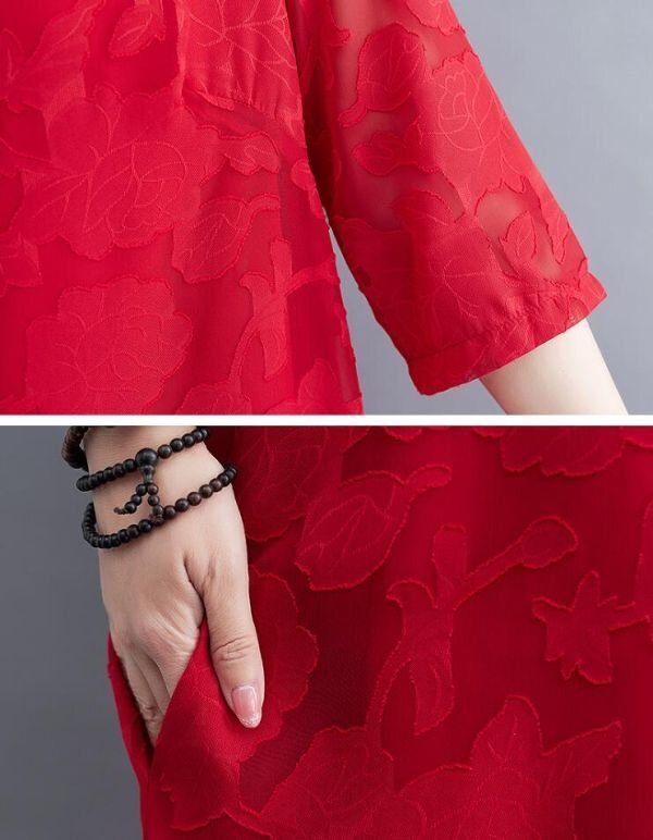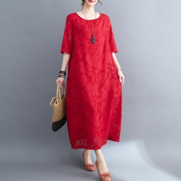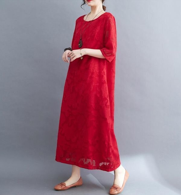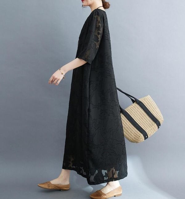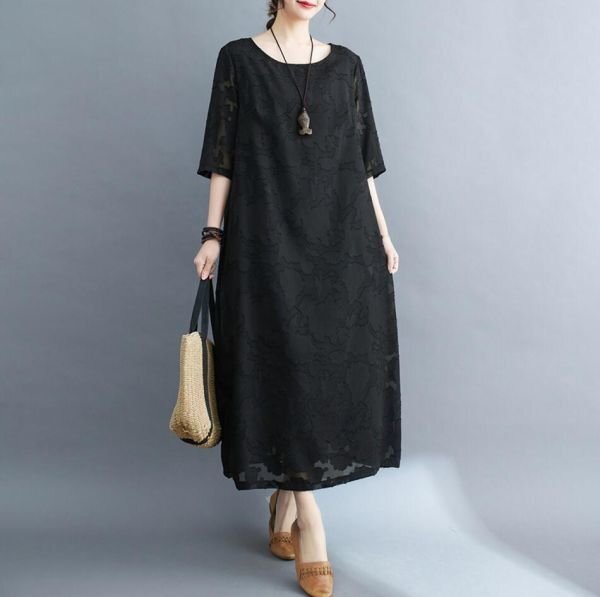 夏新品 花柄 ワンピース レディース マキシ丈 体型カバー 可愛い 大人 五分袖 ロングワンピース★黒/Lサイズ