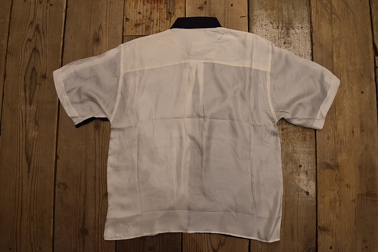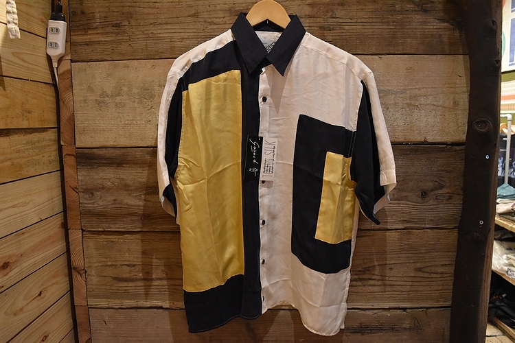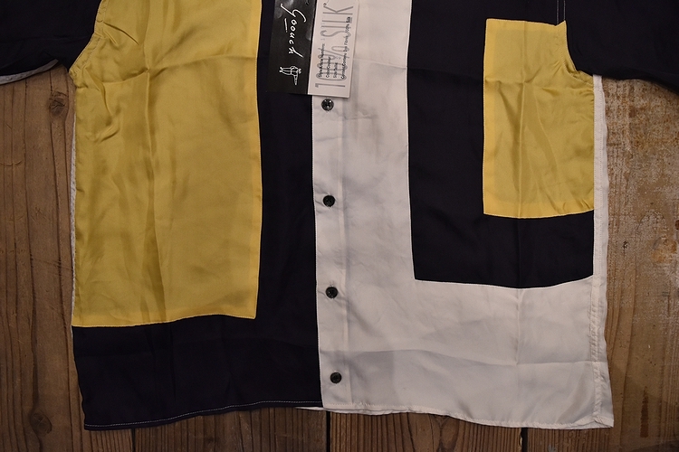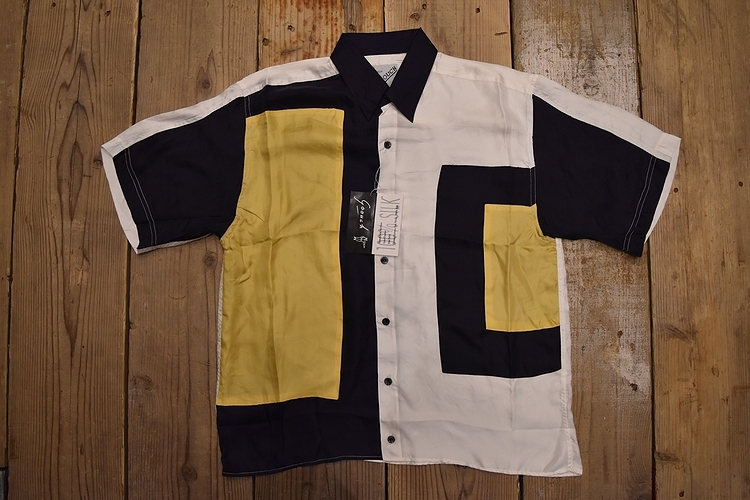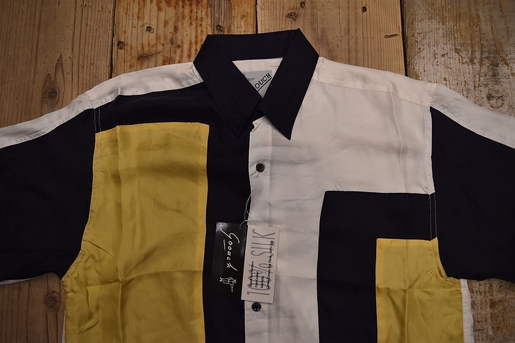 フラッシャー付きデッドストック品◎90sビンテージGOOUCHグーチ半袖オールシルクシャツS白×紺×黄色系アメカジストリート未使用品 t932