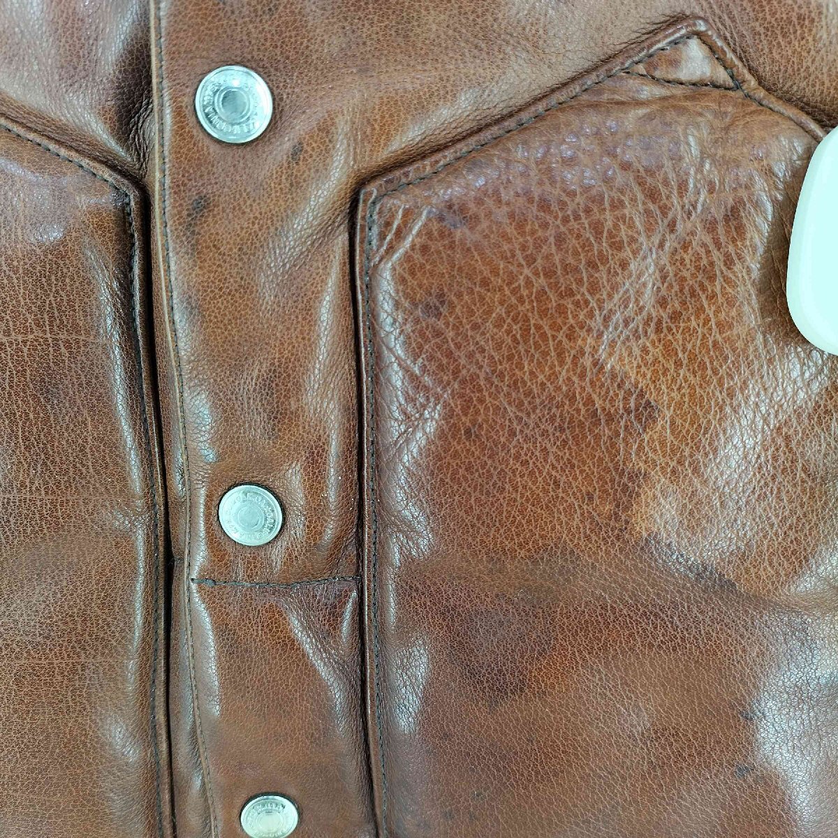 状態詳細 | ケアタグ欠品、襟ぐりに薄汚れ、左ポケットに広範囲にシミ、ヨークを中心に各所にシミ、薄汚れ、第1.2ボタンに青錆がございます。 |
