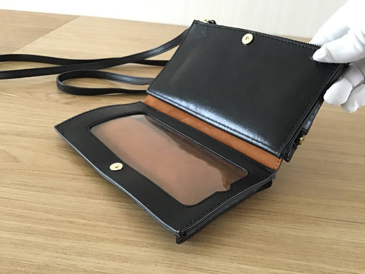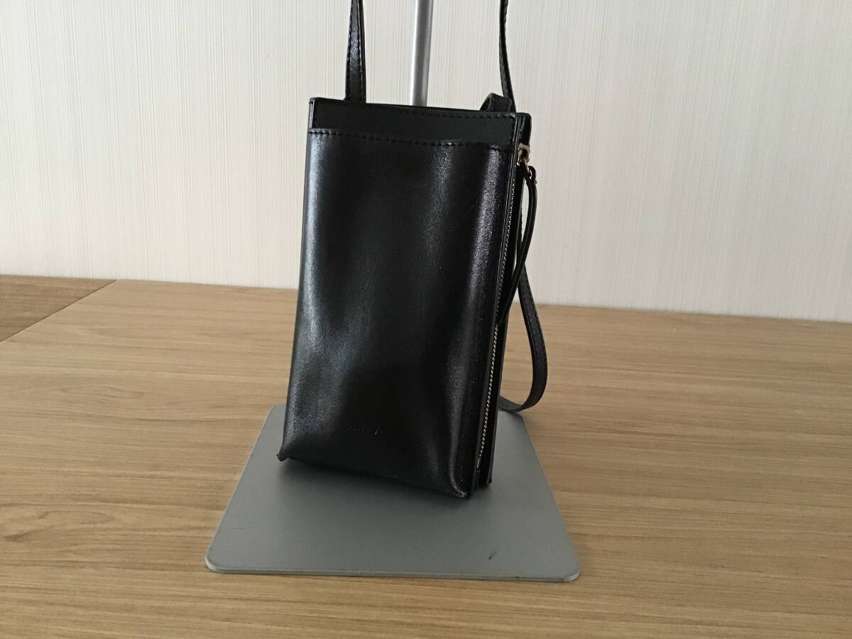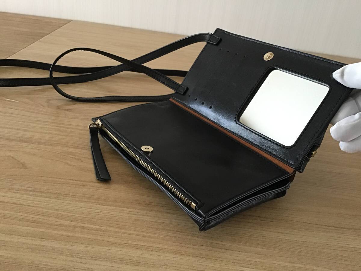 サイズ:縦17.5cm、横10.5cm、まち4cm、ストラップは121.5cm、開口部は2箇所のマグネット留め、中にカードポケット4、ミラー、ファスナーポケット1、外側にスマホポケット1、ファスナーポケット1