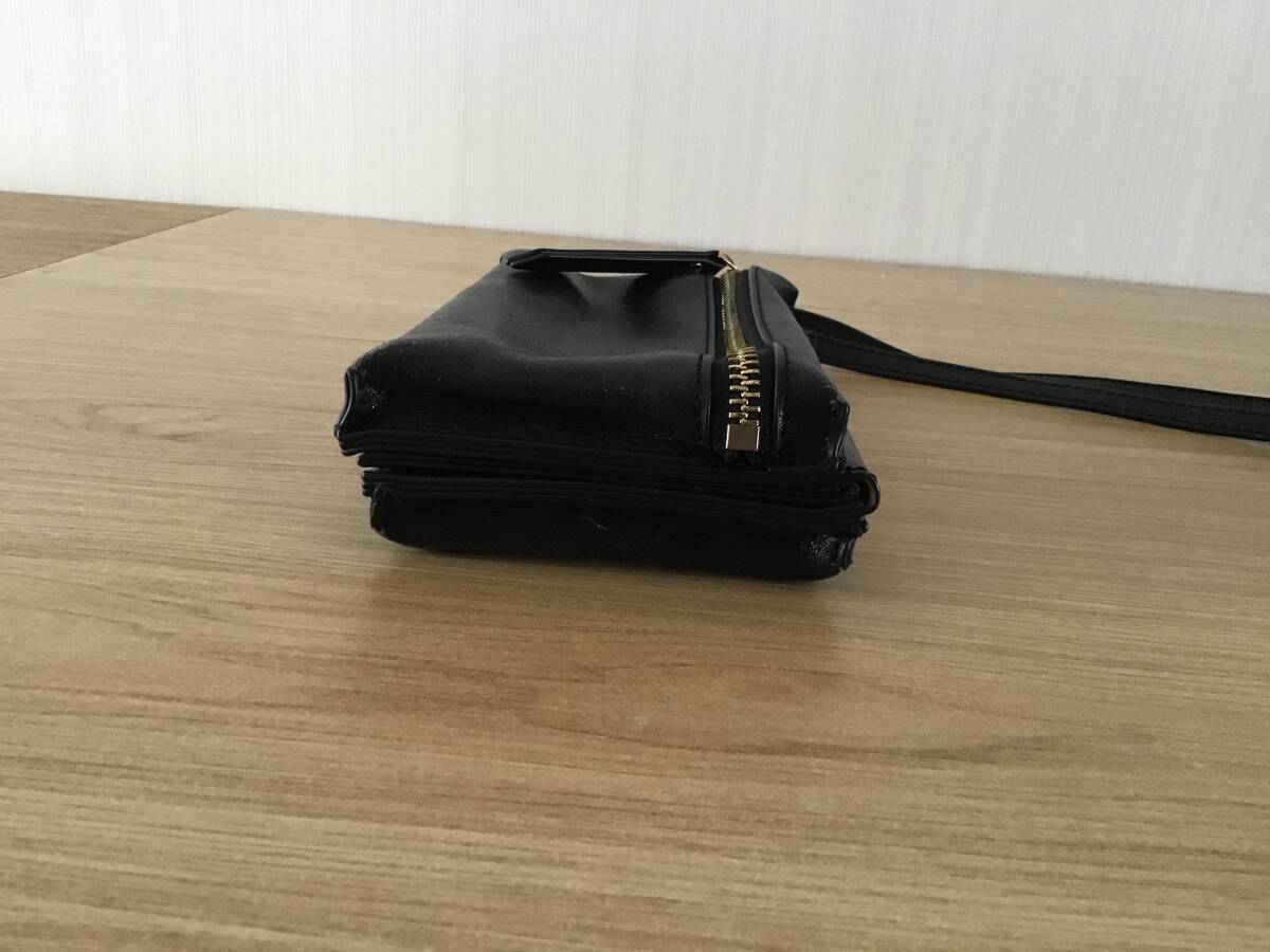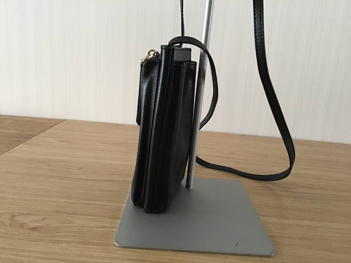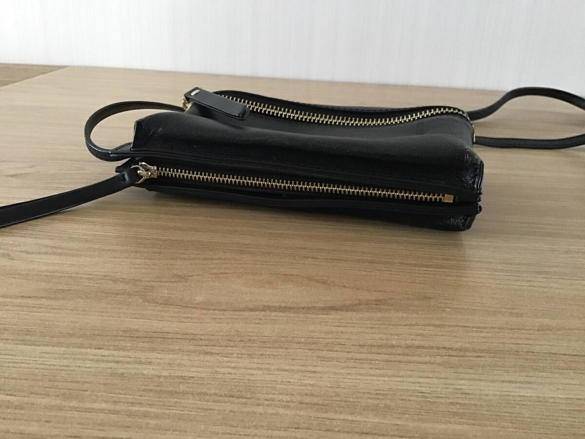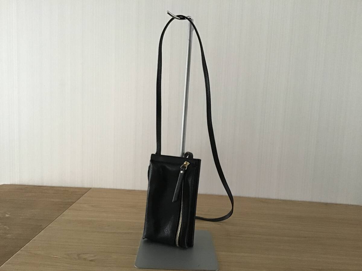 サイズ:縦17.5cm、横10.5cm、まち4cm、ストラップは121.5cm、開口部は2箇所のマグネット留め、中にカードポケット4、ミラー、ファスナーポケット1、外側にスマホポケット1、ファスナーポケット1