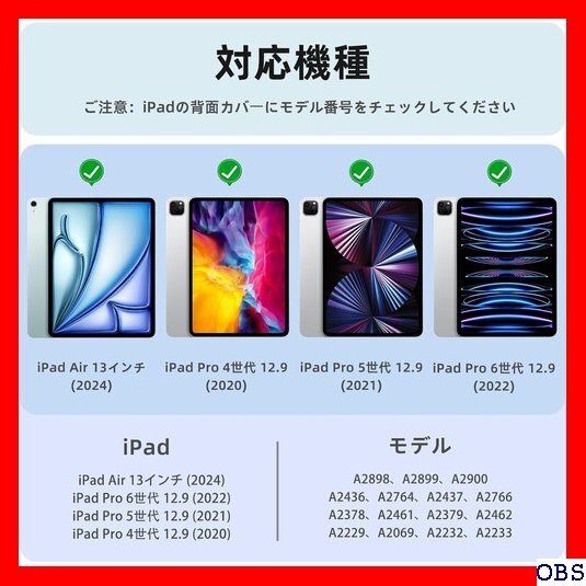 「対応機種」iPad Air 13インチ 2025/2024(A3268、A3269、A3271、A2898、A2899、A2900)/12.9インチのiPad Pro 第6世代 2022(A2436、A2764、A2437、A2766)/iPad Pro 第5世代 2021(A2378、A2461、A2379、A2462)/iPad Pro 第4世代 2020(A2229、A2069、A2232、A2233) 専用です。 他のモデルに適用されません。ご購入前、お持ちのiPadのモデル番号をご確認いただきます。