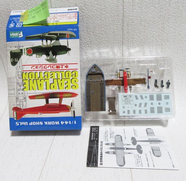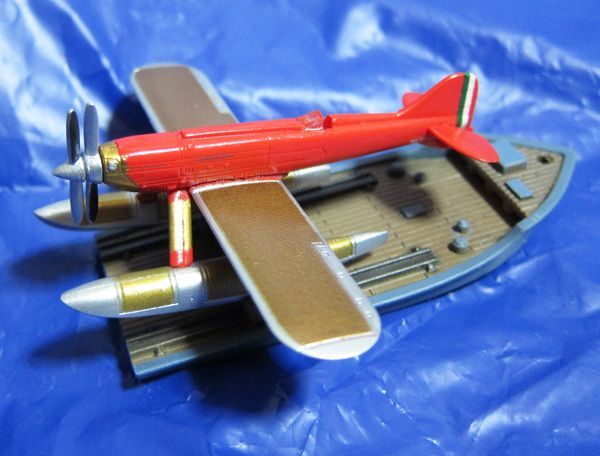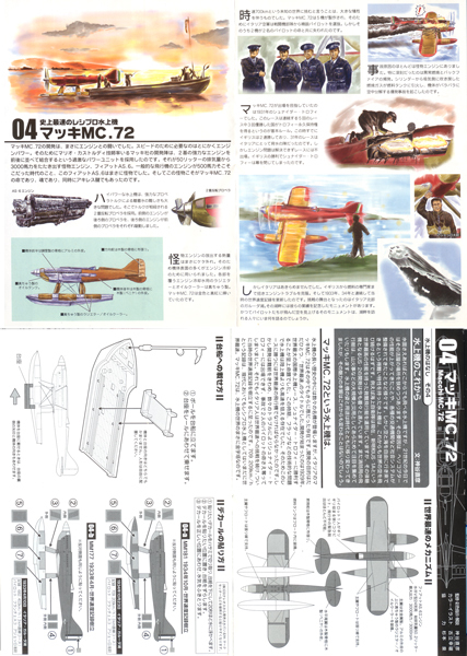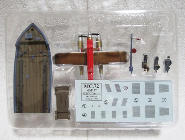 商品はF-toys(エフトイズ・コンフェクト)から2005年に発売された1/144 WORK SHOP VOL.5 SEAPLANE COLLECTION 水上機コレクションから『マッキMC.72 MM177 1933年4月・世界速度記録樹立』になります。 外箱開封済み、ブリスター未開封の新品になります。 1933年に世界記録を出した時の塗装でフロートや主翼の外縁が銀色塗装です。 ◆趣味のマッキMC72 シュナイダー・トロフィー・レースという水上機のスピードレースがあるのですが、これに優勝する為に作られたのがマッキMC.72。 でもエンジントラブルに悩まされ、結局優勝する事が無いまま、1931年にシュナイダー・トロフィーが終了してしまいました。 しかし、あきらめなかったイタリアは、その後、エンジントラブルを克服、1933年に時速682kmという凄まじい数字を出しました。 そして、この機体の凄いところは、自らが出した世界記録を塗り替えた所。翌年の1934年に打ち立てた時速709kmという水上機の世界記録は、現在まで破られておりません。 これを実現する為、2基のエンジンを前後に並べて結合し(しかもターボで液冷)、3100馬力という凄まじい出力を出しました(この時代の飛行機は500馬力ぐらい。第2次世界大戦後半の紫電改や烈風、F6Fでも2000馬力ぐらい。凄い大出力エンジン~)。同時に機体には可能な限り軽量化&排熱対策を施しました。 また、プロペラは二重反転プロペラで、プロペラの回転で発生するトルクを打ち消して真っすぐ飛ぶようにしてあります。 この機体、軽量化と放熱の為に様々な素材を使ってるのですが、レースの時はキレイに塗装されてました。 主翼はアルミ外皮の上に真鍮製のラジエーターを搭載、フロートは燃料タンクと兼用でフロート上面もラジエーター。機体の前半分(エンジンがある)は鋼管のフレームに放熱性の高いアルミを張り、機体の後ろ半分は木製フレームにベニヤ張りです。 なのでこの模型でも胴体は赤色で塗装されてますが、主翼やフロート上面はメタリックレッドで塗装されてます。 台船と台車、作業員3人付き。 F-toys製なので、出来も素晴らしく、モールドも細かく、塗装も鮮やかです。 特に主翼やフロートのメタリック塗装が大変美しいです。 全長:約6cm弱 組み立てる所はありませんが、デカールの貼り付けが必要です。 写真の1枚目は、箱とブリスターとリーフレット。 写真の2枚目は、見本。 写真の3枚目は、ブリスターの上から。 写真の4枚目は、リーフレット。 |