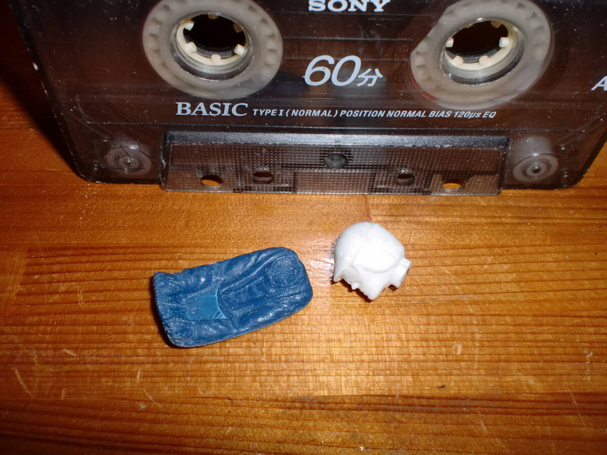 完成すると、前後3㎝、横1.5㎝、高さ2㎝ほど、カセットテープはサイズの比較です。