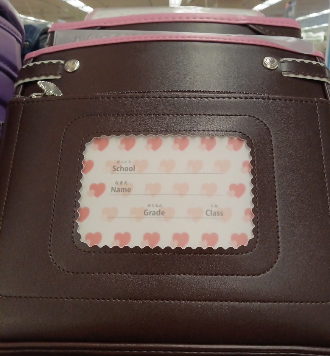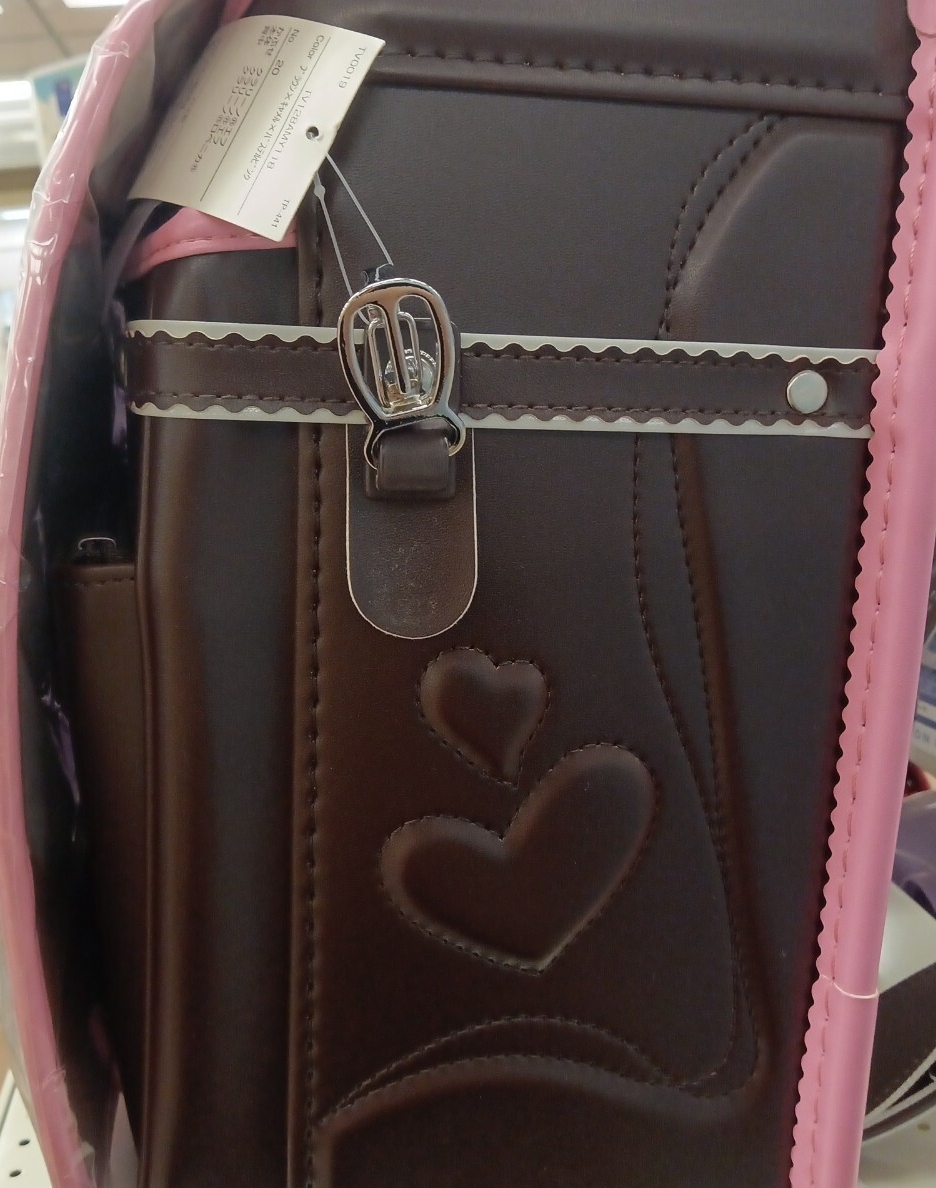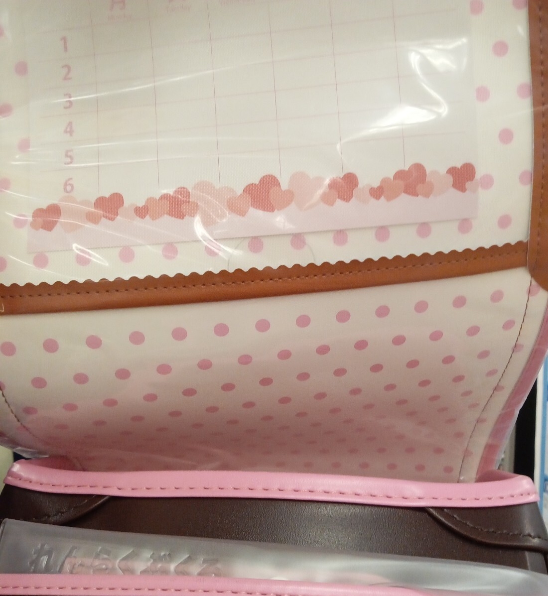 ハートモチーフのブラウンランドセル、日本製で名札入れ付き。