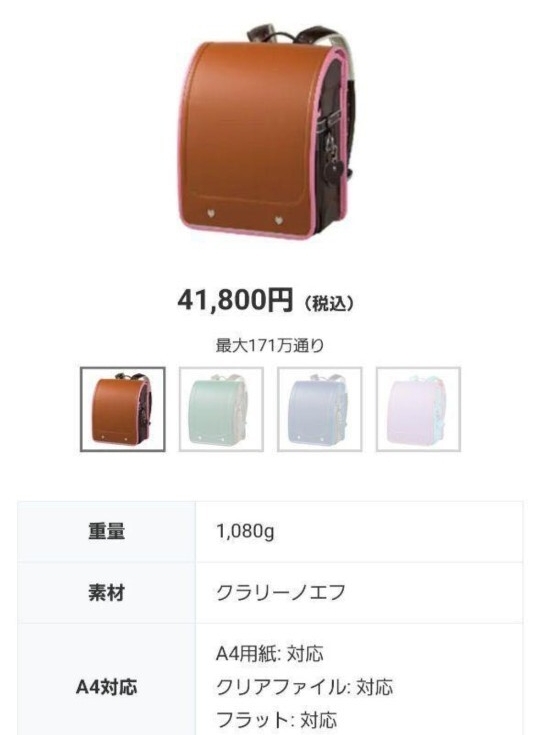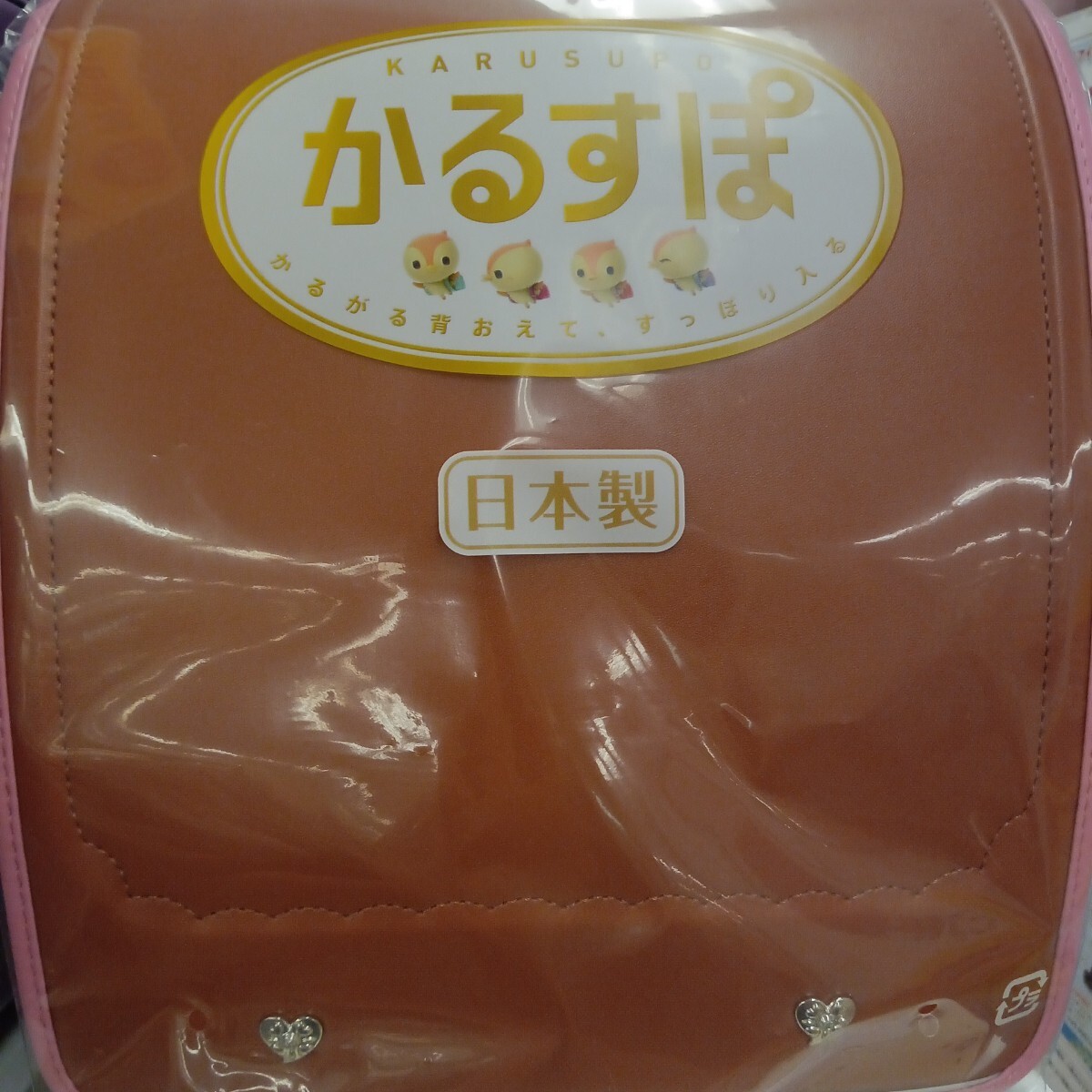 前がキャメル、横がブラウンの可愛いランドセル。縁取りのピンクが映えますね。