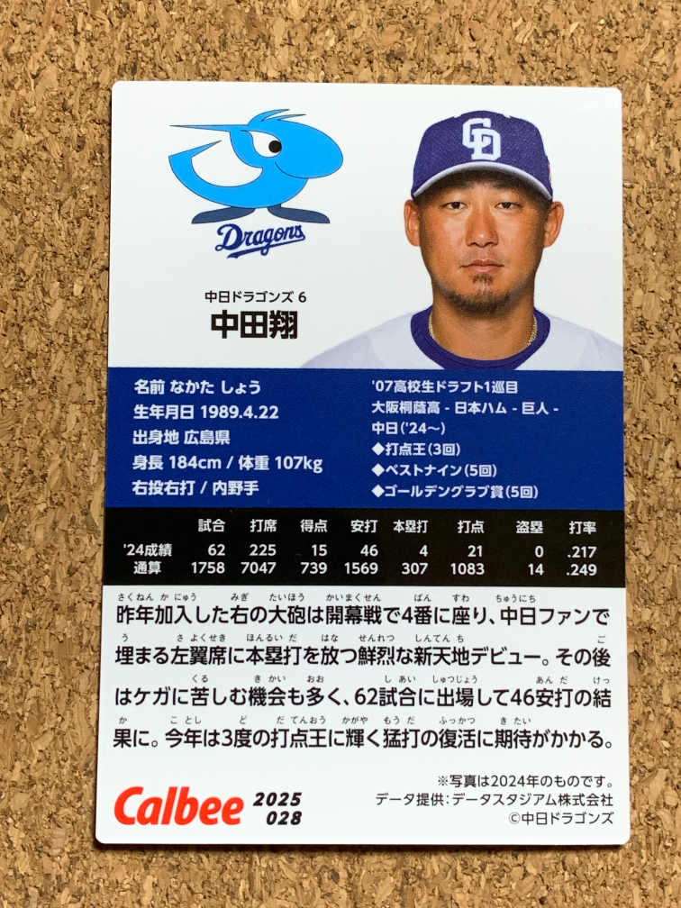 (2025プロ野球チップス 第1弾 レギュラーカード 028 中日ドラゴンズ 中田 翔)