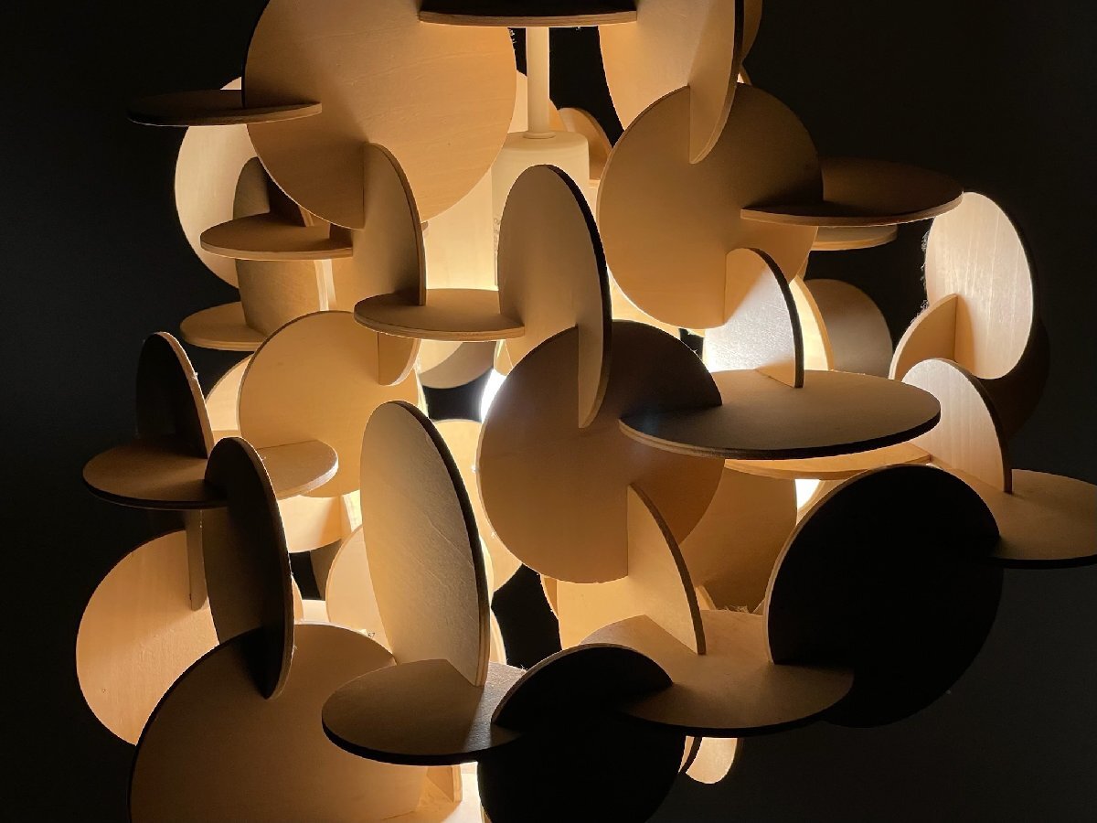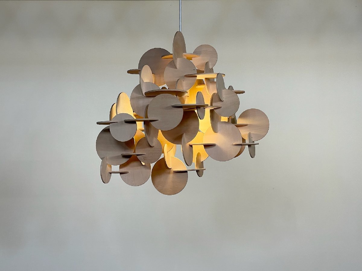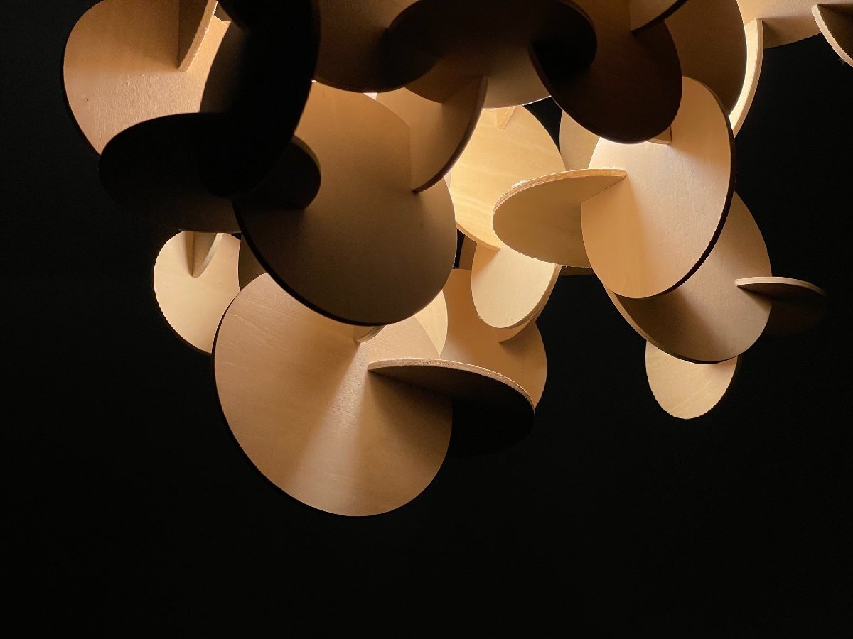 円形の木製パーツを有機的なシルエットで組み合わせ、見る角度により表情を変えるオーナメントとしての機能をライティングデザインに落とし込んだ、国内流通は希少なペンダントライトクリエイション。Norman Copenhagen より。