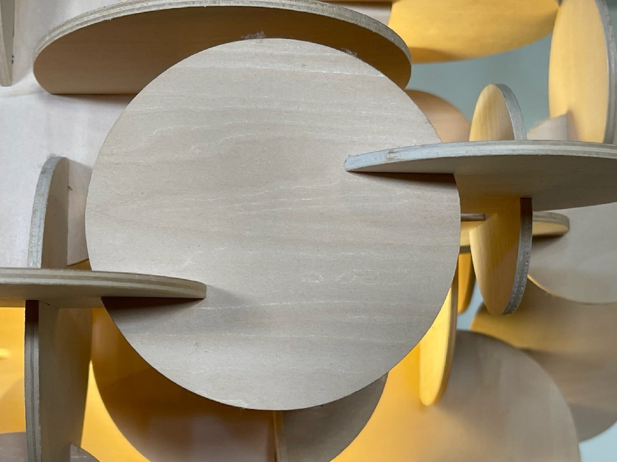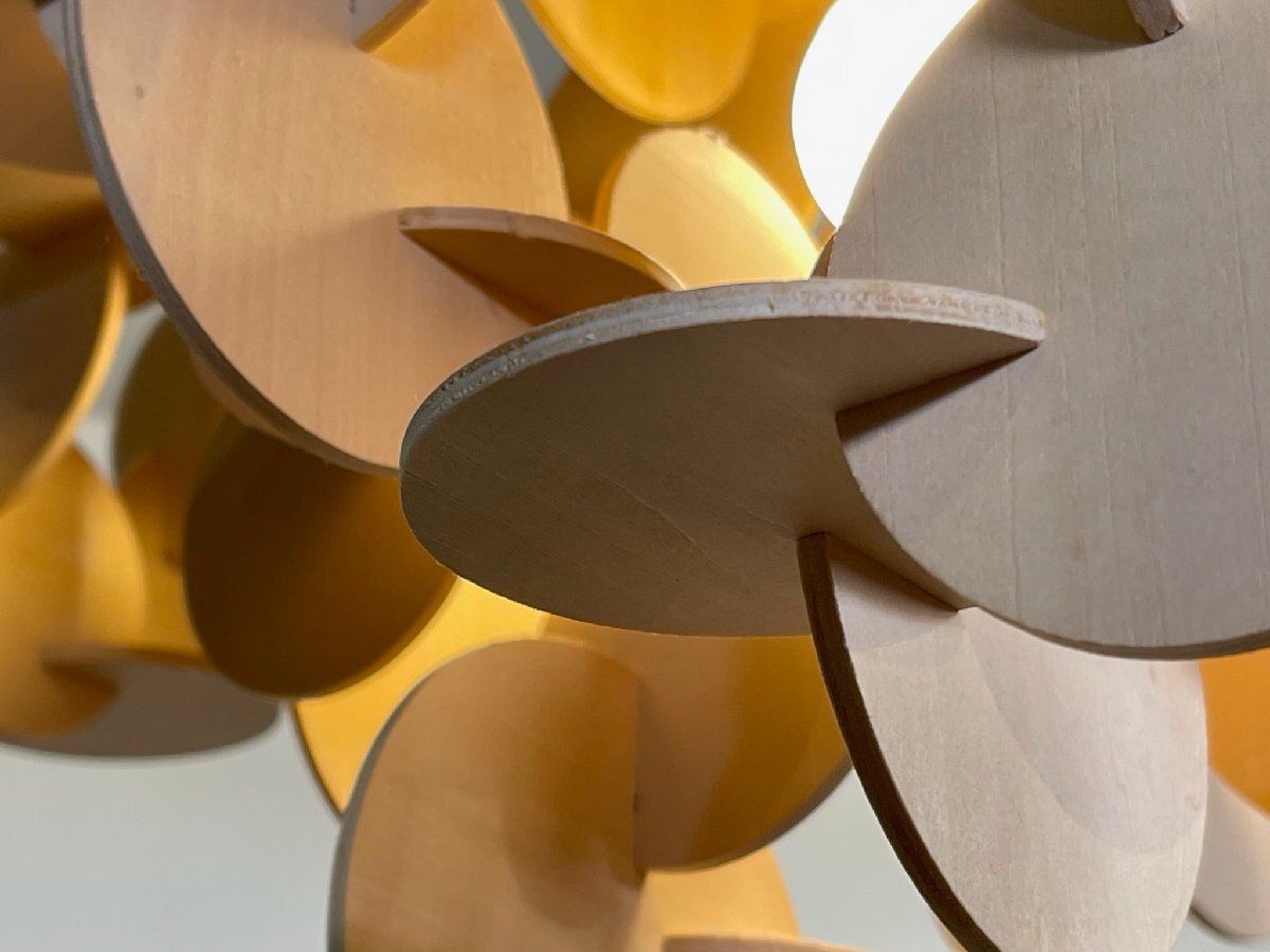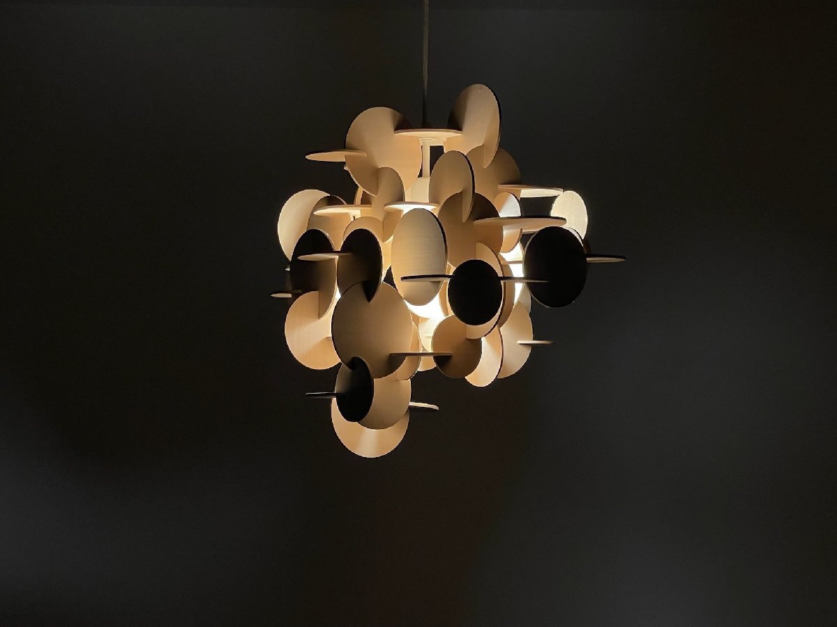 円形の木製パーツを有機的なシルエットで組み合わせ、見る角度により表情を変えるオーナメントとしての機能をライティングデザインに落とし込んだ、国内流通は希少なペンダントライトクリエイション。Norman Copenhagen より。