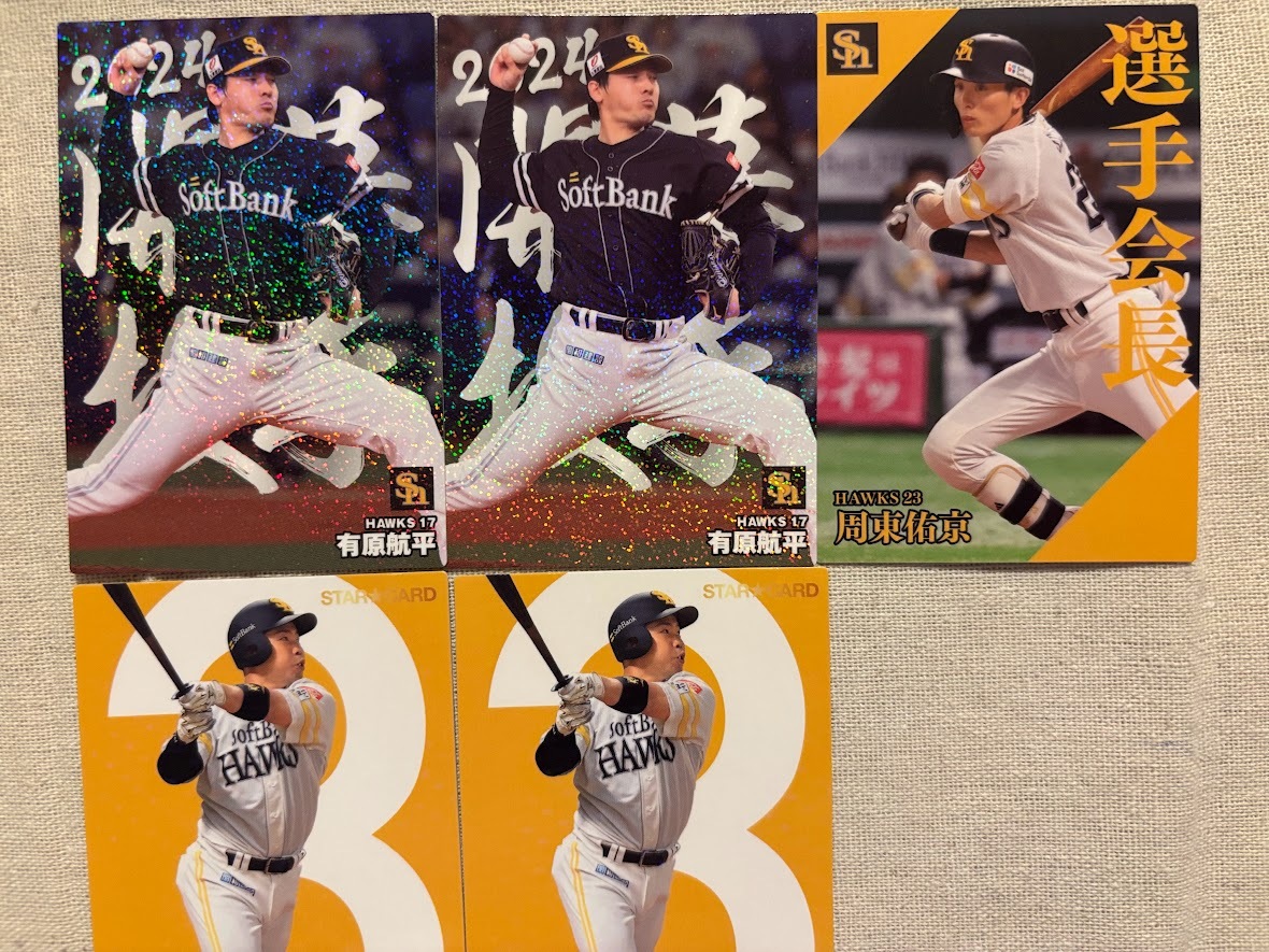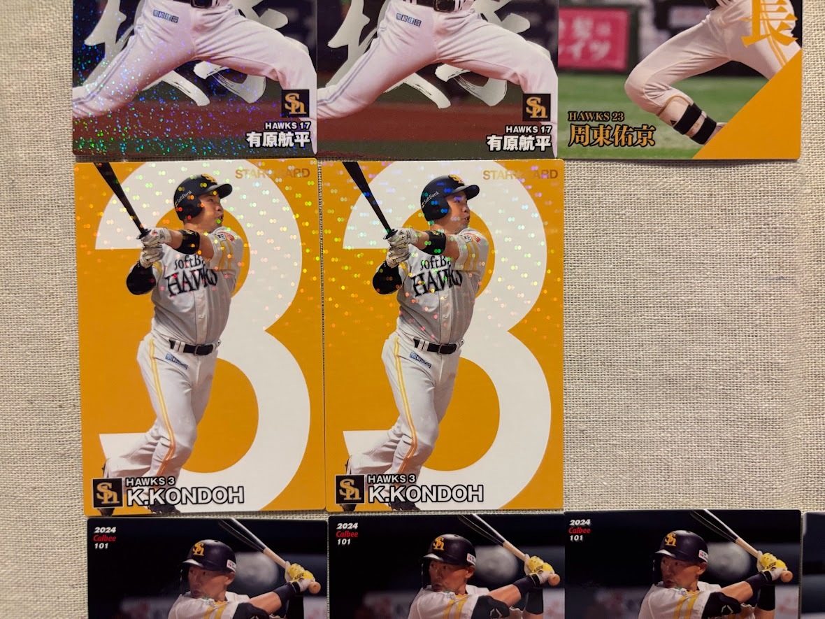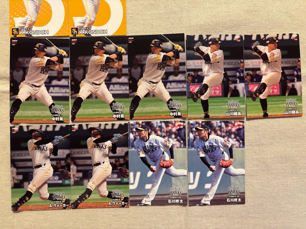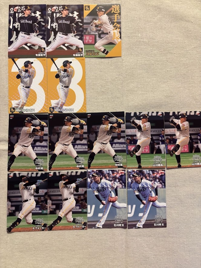 カルビー プロ野球チップス2024 第2弾 福岡ソフトバンクホークス ■開幕投手カード 有原航平×2枚 ■選手会長カード 周東佑京 ■スターカード 近藤健介×2枚 ■レギュラカード 中村晃×3枚 山川穂高×2枚 A.ウォーカー×2枚 石川柊太×2枚 以上の計14枚セットです。 開封後、この14枚をまとめて袋に入れて保管しておりました。 神経質な方はご遠慮ください。 | ||||||||
