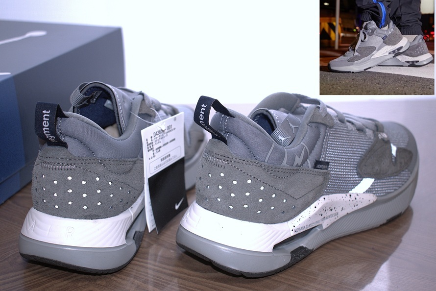 ヒールにはフラグメントロゴのプルタグ、ヒールサイドには"フラグメント"の象徴"サンダーロゴ"と、"JORDAN"の文字をさり気なく施し、嫌みなく両ブランドのコラボ感をアピールしてます。