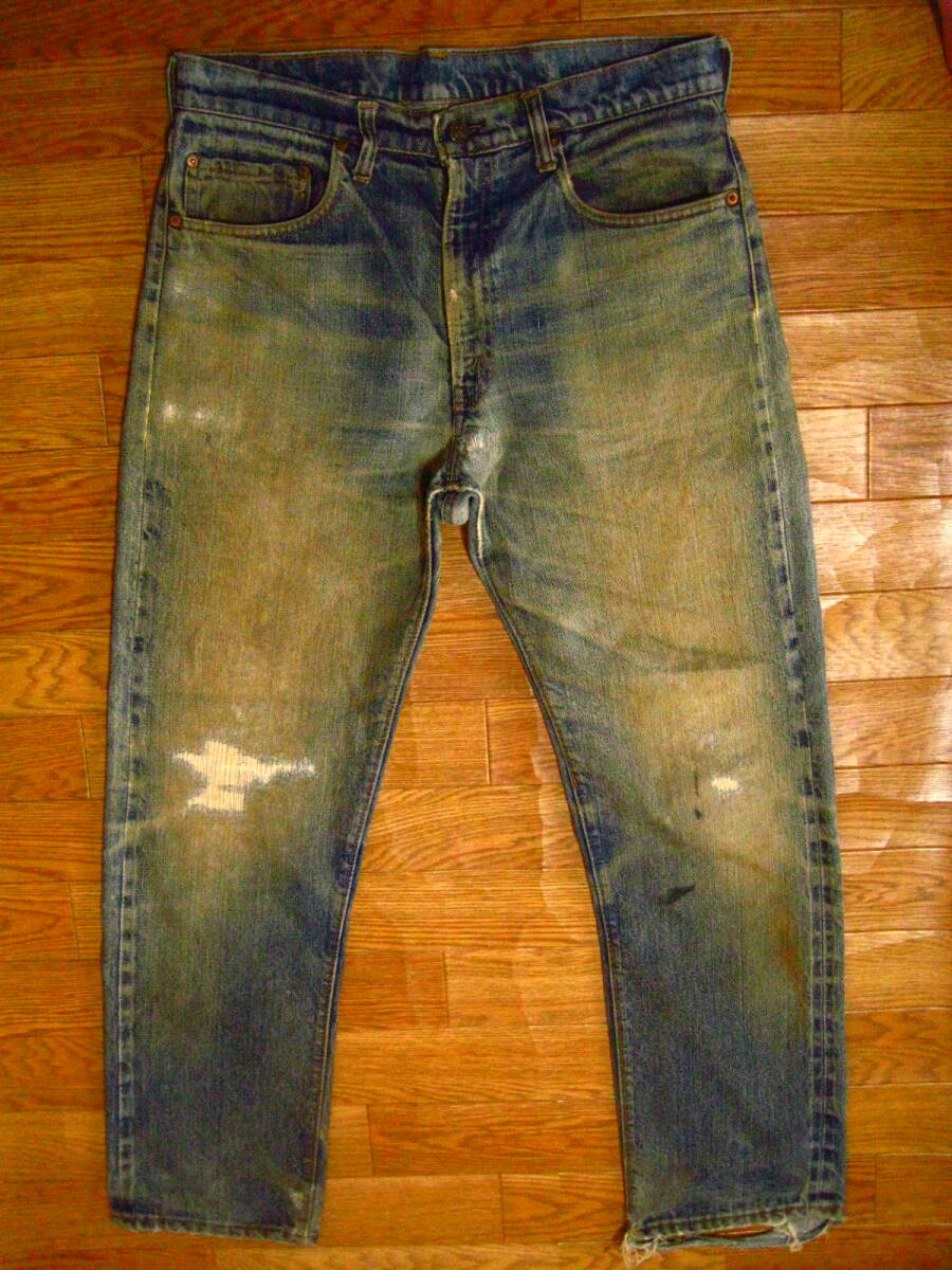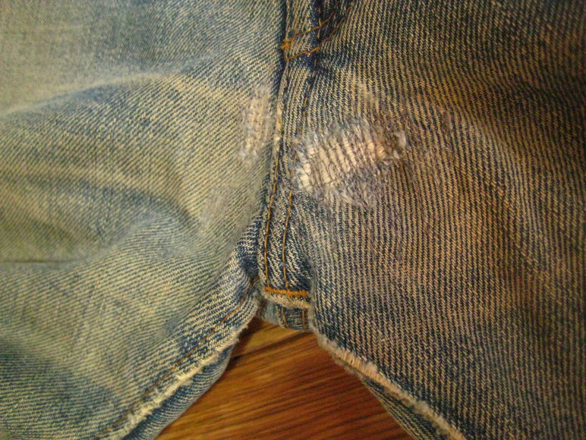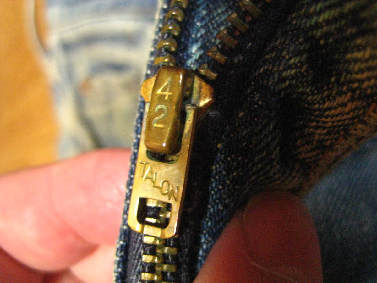 。○●サイズ表記●○。 W34L30 ジップフライ 。○●平置きで実寸サイズ●○。 ウエスト約86㎝、レングス約76㎝、裾幅約20㎝ 太もも幅約32cm、股上前約30㎝、総丈約106㎝ ●風合いが最高です。 ●紙パッチ(近くに横糸のホツレあり)・赤タブ・バックポケット・コインポケットの縁はシングルステッチ・ボタン裏5表示・TALON42ジップ・平行ステッチ・フロントチャック下あたりと両ひざと右ポケットあたりにリペア補修あり・セルビッジ・裾はチェーンステッチ(ホツレ有)などなど。 ●極上の風格、しっかりとしたメリハリ感、ヒゲ・アタリ・タテ落ち感もこれから楽しめる1本になります。 ●実にカッコいいパンツになっております。激安で出品いたしますのでぜひこの機会にどうですか!!!