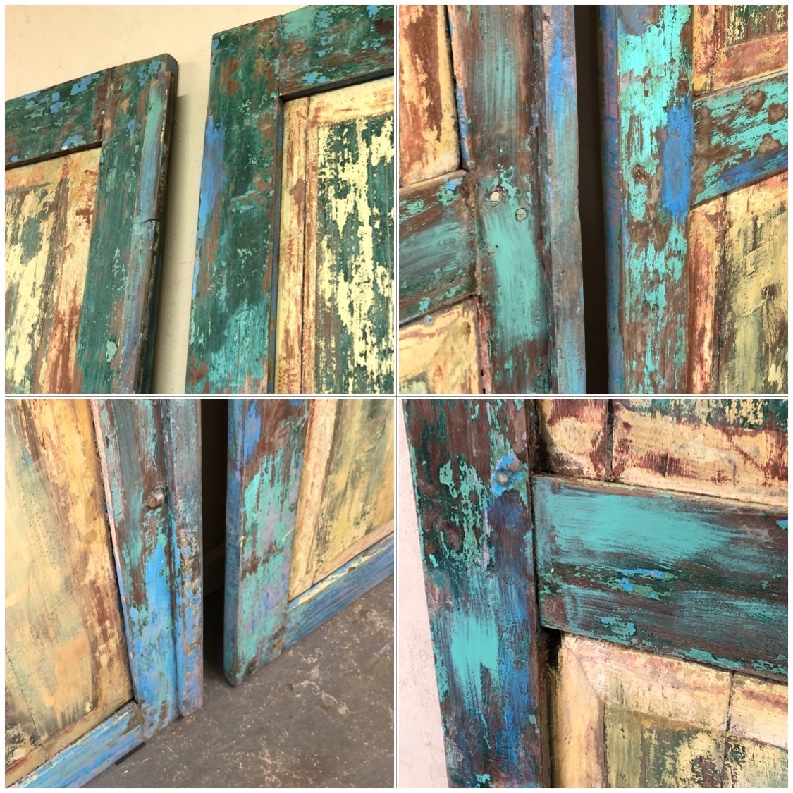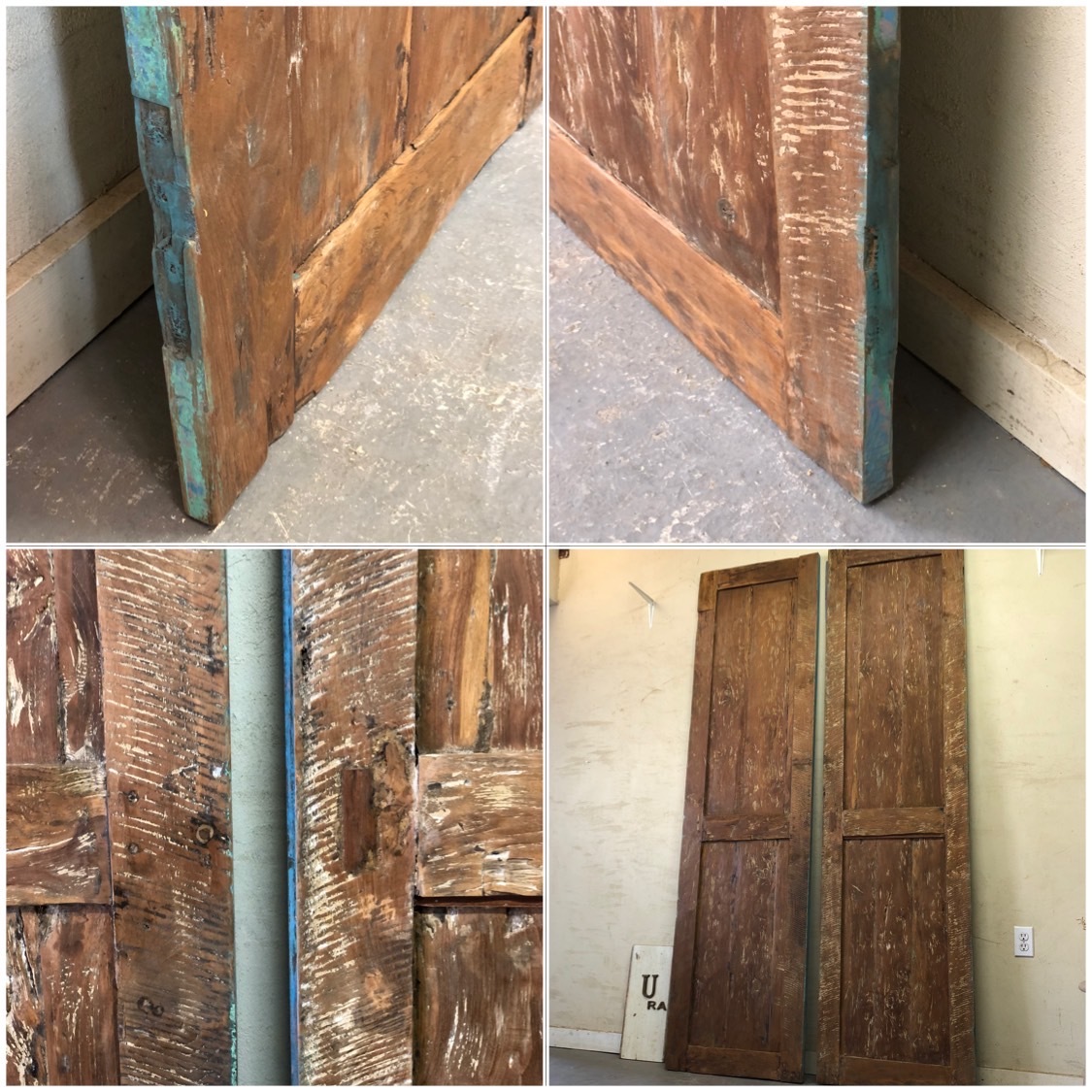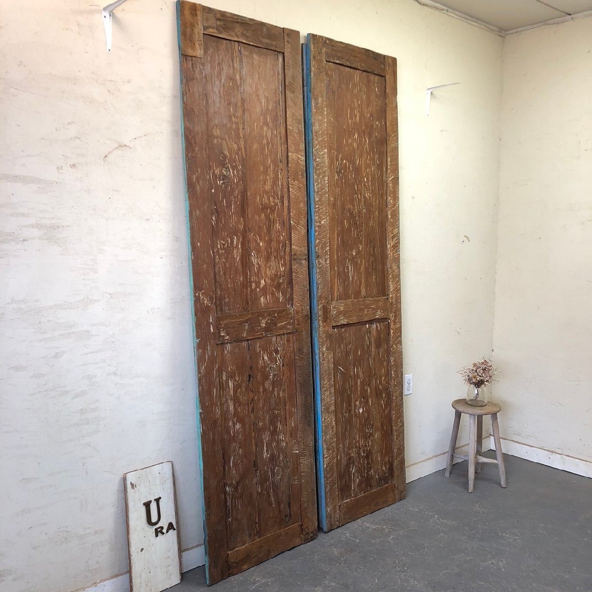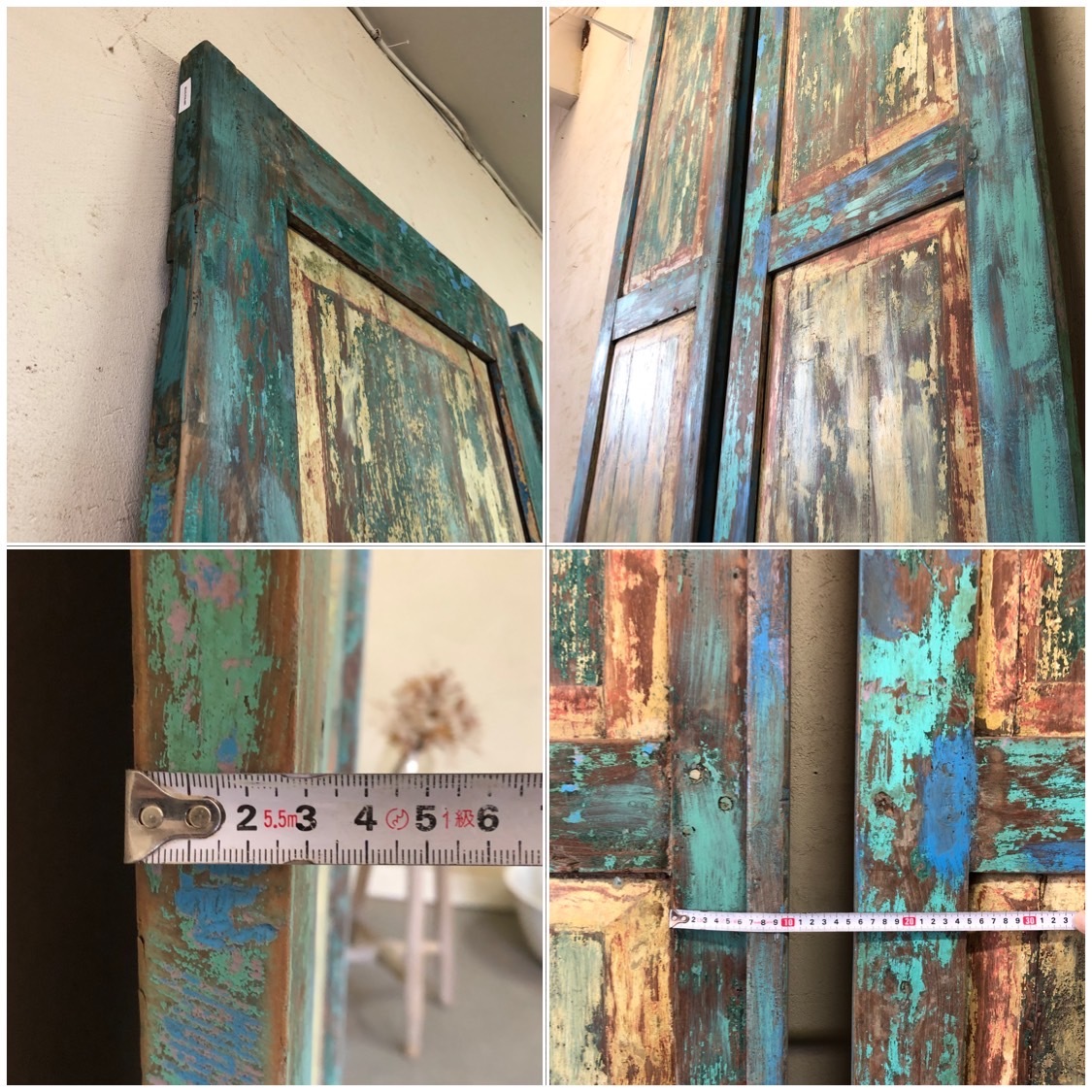 材質:このアンティーク扉は、大変古いモノで何度も修理とペイントを繰り返しながら大切に使われ続けた両開きドアです。材料はチーク材で耐久性・耐水性・耐腐食性に優れていて、黄金色の美しさと経年による色調の変化を愉しめる材質です。職人の手作りによって作りこまれた商品は、味わい深く使い続けることによってより深みを増していくことでしょう。