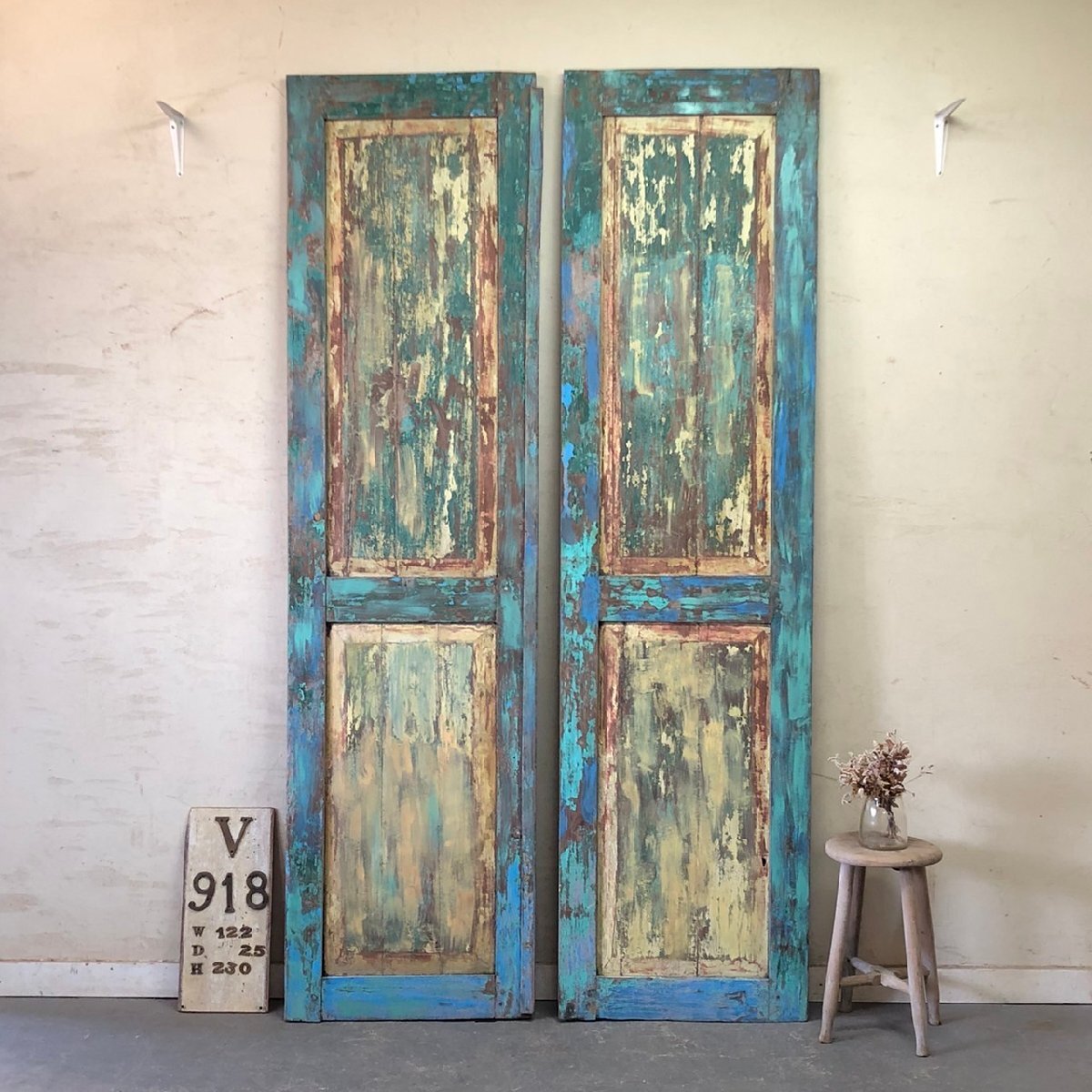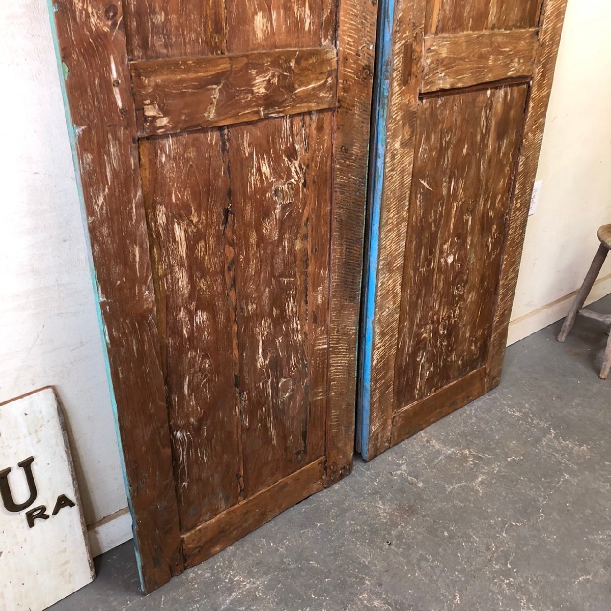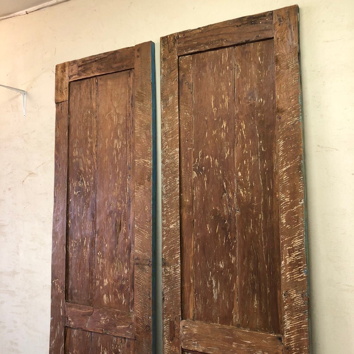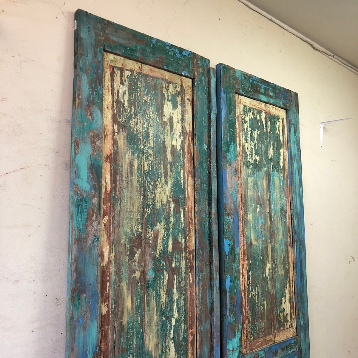 材質:このアンティーク扉は、大変古いモノで何度も修理とペイントを繰り返しながら大切に使われ続けた両開きドアです。材料はチーク材で耐久性・耐水性・耐腐食性に優れていて、黄金色の美しさと経年による色調の変化を愉しめる材質です。職人の手作りによって作りこまれた商品は、味わい深く使い続けることによってより深みを増していくことでしょう。