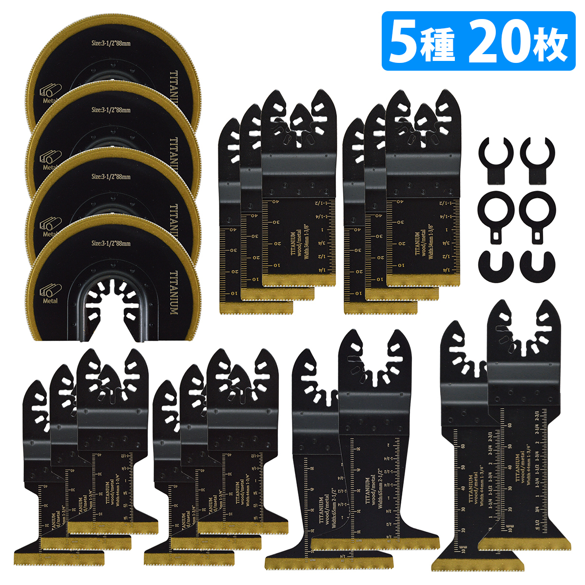 刃先チタンメッキ 5種 20枚セット 超硬 替刃 金属/木材 カットソー ブレード 日立 ボッシュ マキタ ハイコーキ 替え刃 互換