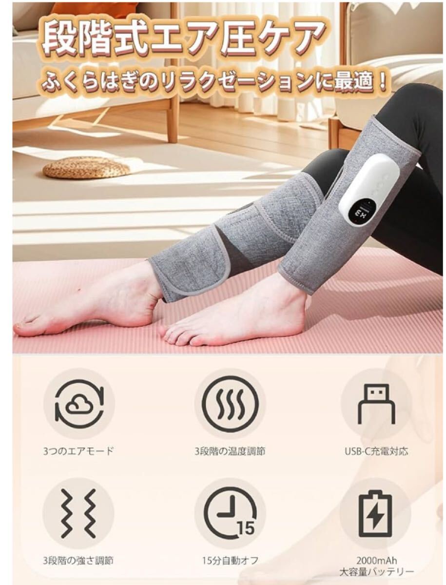 Marunoo ふくらはぎケア 【2025新登場】 エアーレッグリラックス 空気圧 温熱 コードレスUSB充電式 3モード× 3段階強度 × 3段階温度 操作簡単 太もも 足ケア サイズ幅調整可 15分タイマー
