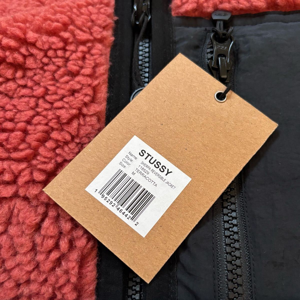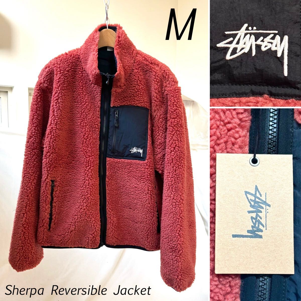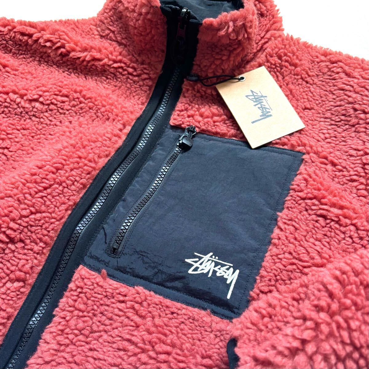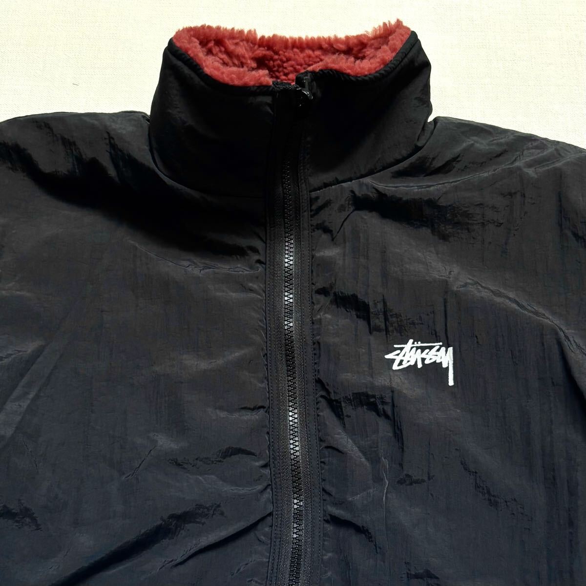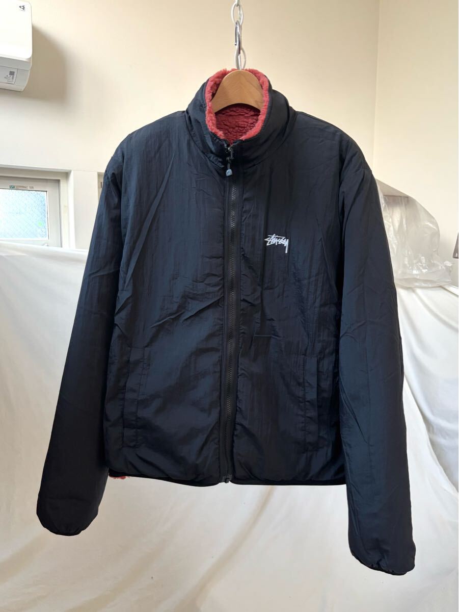 STUSSYのSHERPA REVERSIBLE JACKETです。ボリューム感のあるボアフリース(表面)とシンプルなブラック無地のナイロン地(裏面)のリバーシブルジャケット。