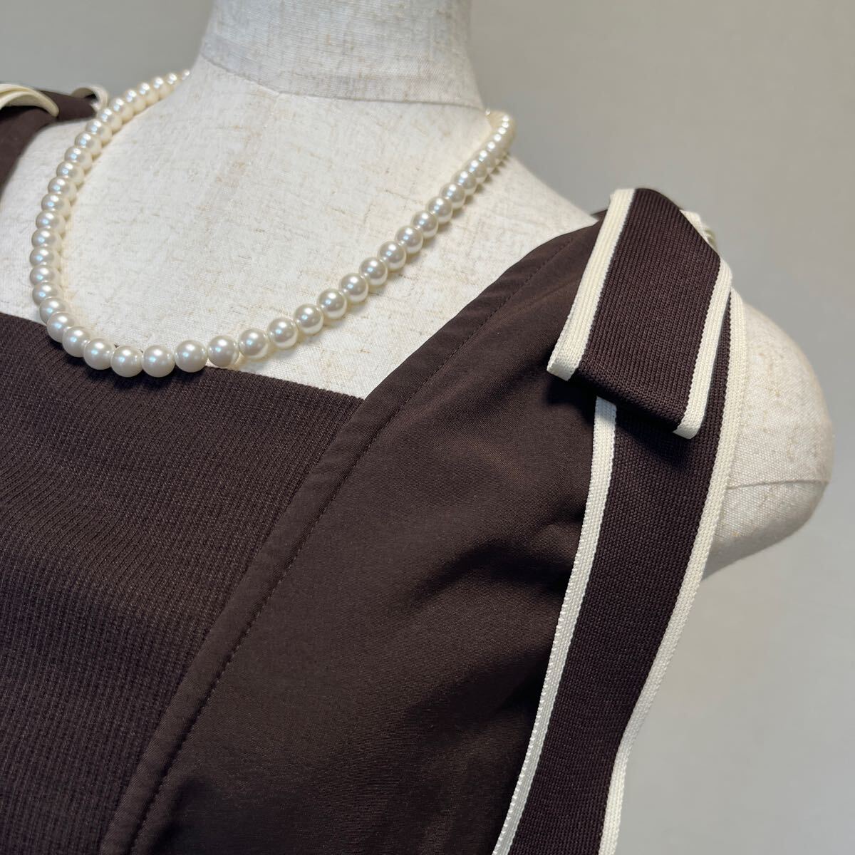 配色長いリボンでトレンド感のあるスタイリングが叶うトップス。 1枚でも、シアーニットやTシャツの上にレイヤードするのもおすすめで、インナー次第で春夏秋冬のロングシーズン楽しめます。 ノースリーブですが、配色リボンが気になる肩をカバー◎ クロップド丈なので上半身がコンパクト見えします。 デニムやスラックスとカジュアル合わせはもちろん、フレアスカートやマーメイドスカートと合わせると上品なスタイルに仕上がります。 ネックレスはついていません。