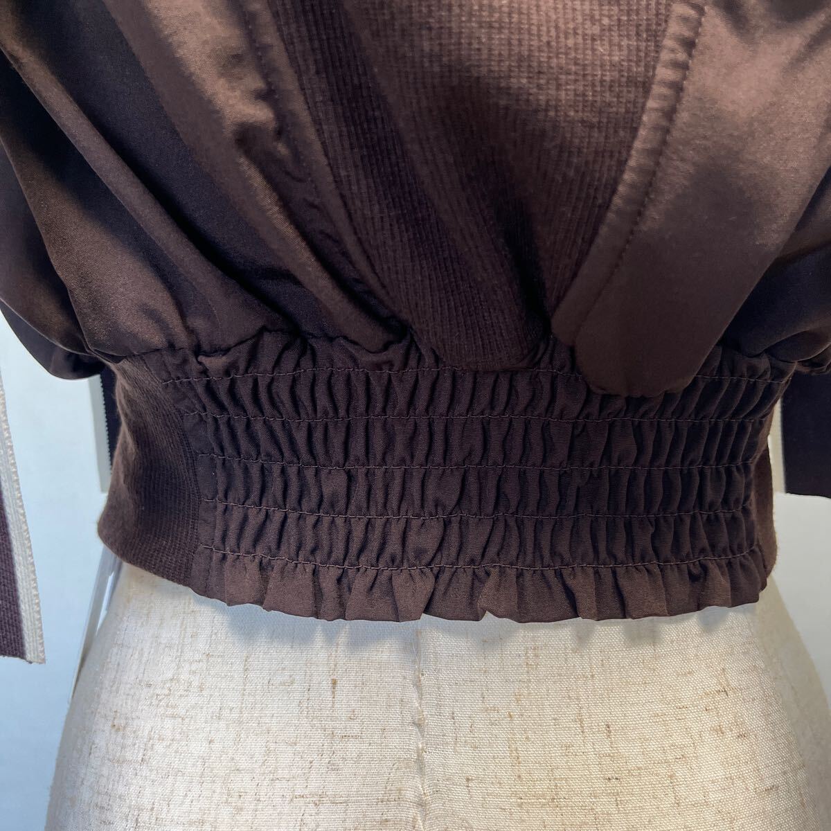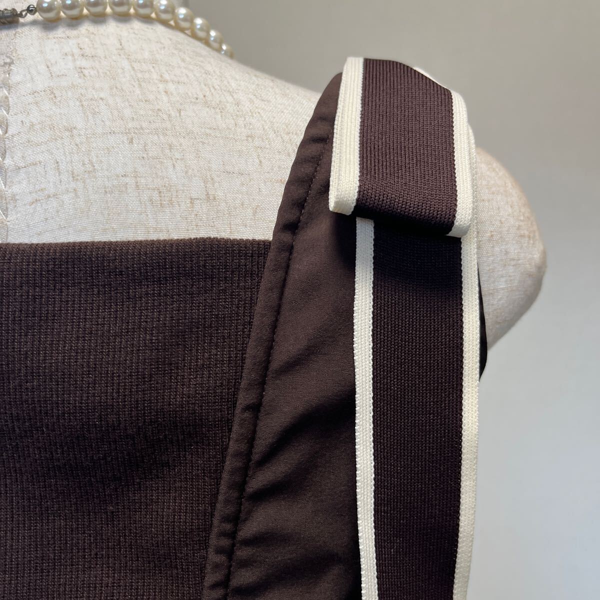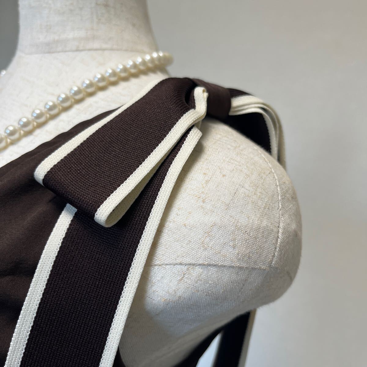 7-7新品 配色肩リボンキャミソール リブニット×シフォン異素材切替ノースリーブカットソートップスビスチェ ブラウン 茶 9号 M