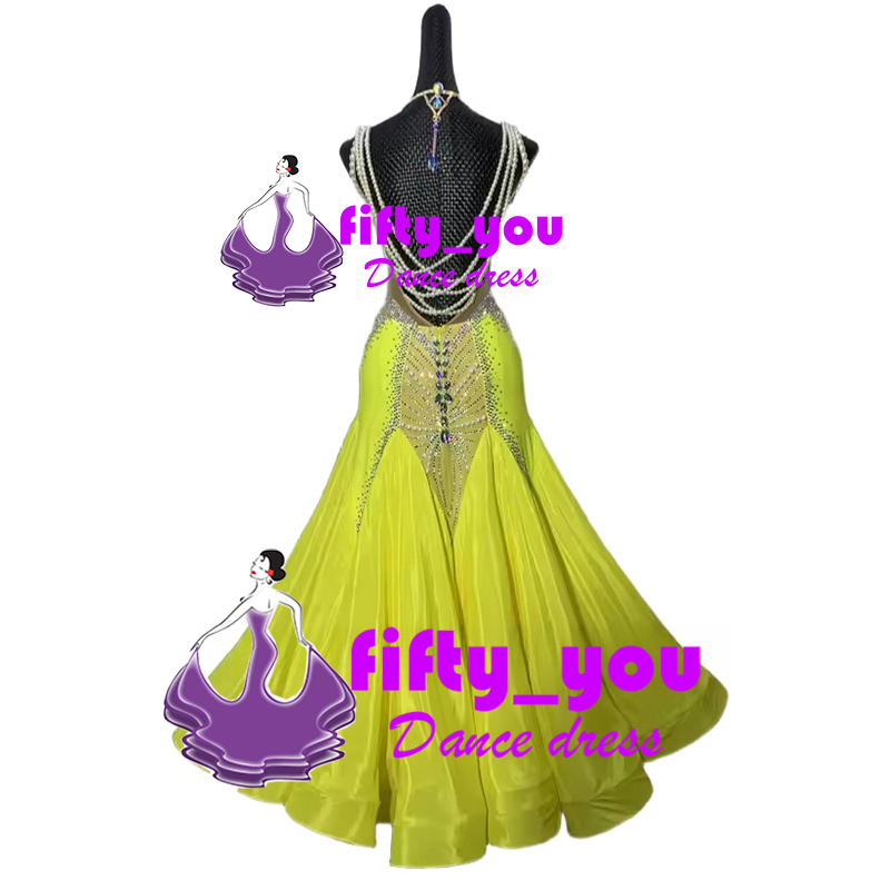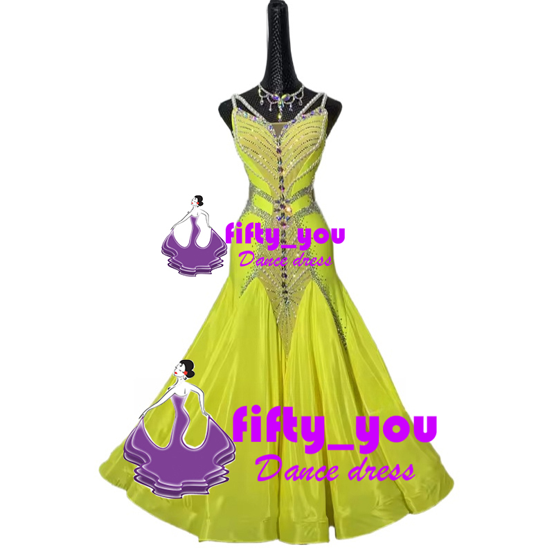 新品fifty_youレディース社交ダンス衣装 競技ドレス セミオーダー  高級モダンドレス  スタンダードドレス ファーフロート 黄色