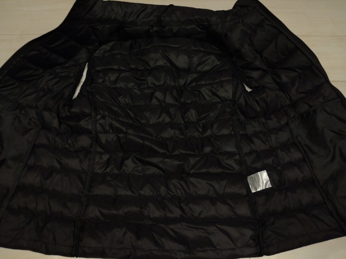 ※かなり軽めのダウンベストです。カラーはブラックとなります。お腹部分の左右にファスナー付のポケットが付いています。ポケッタブル収納用の袋も付いています。